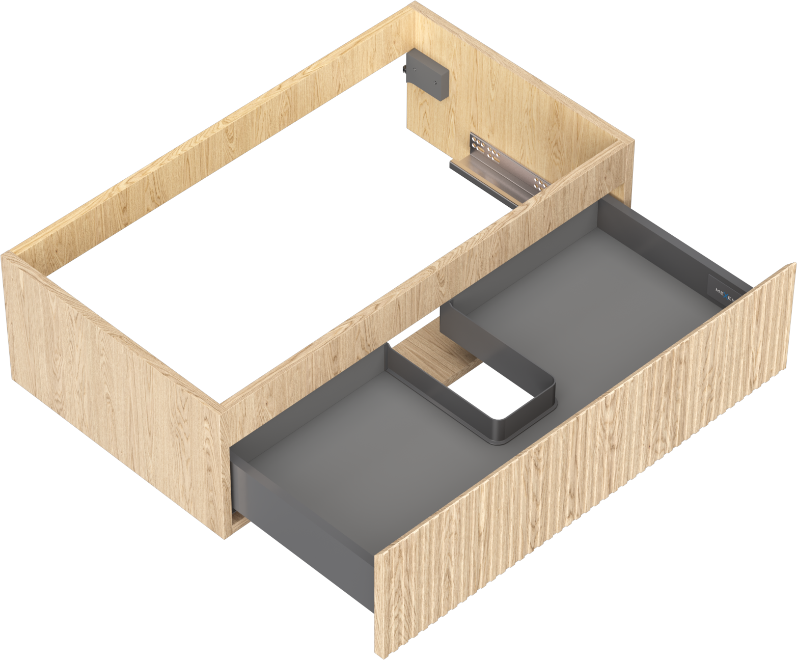 La découpe dans le tiroir est conçue de manière à accueillir le siphon, qui est nécessaire dans les installations de lavabo. Ainsi, le meuble peut être installé de manière pleinement fonctionnelle, sans devoir renoncer à l'espace du tiroir au profit de l'installation.