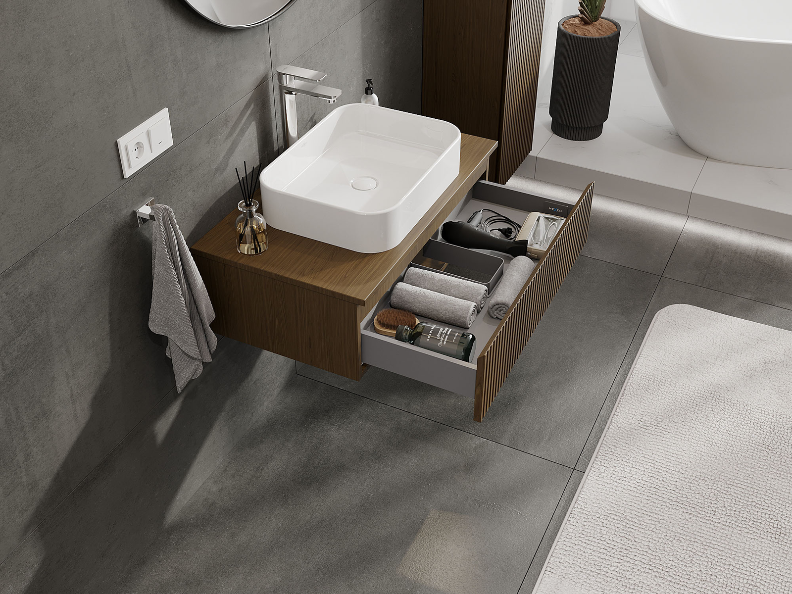 La découpe dans le tiroir est conçue de manière à accueillir le siphon, qui est nécessaire dans les installations de lavabo. Ainsi, le meuble peut être installé de manière pleinement fonctionnelle, sans devoir renoncer à l'espace du tiroir au profit de l'installation.