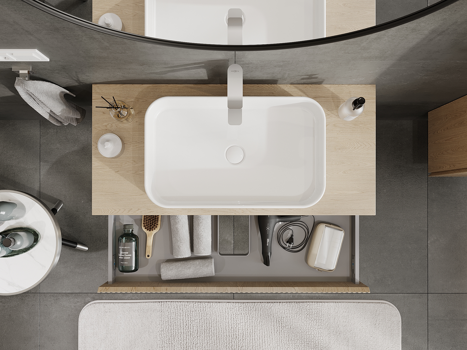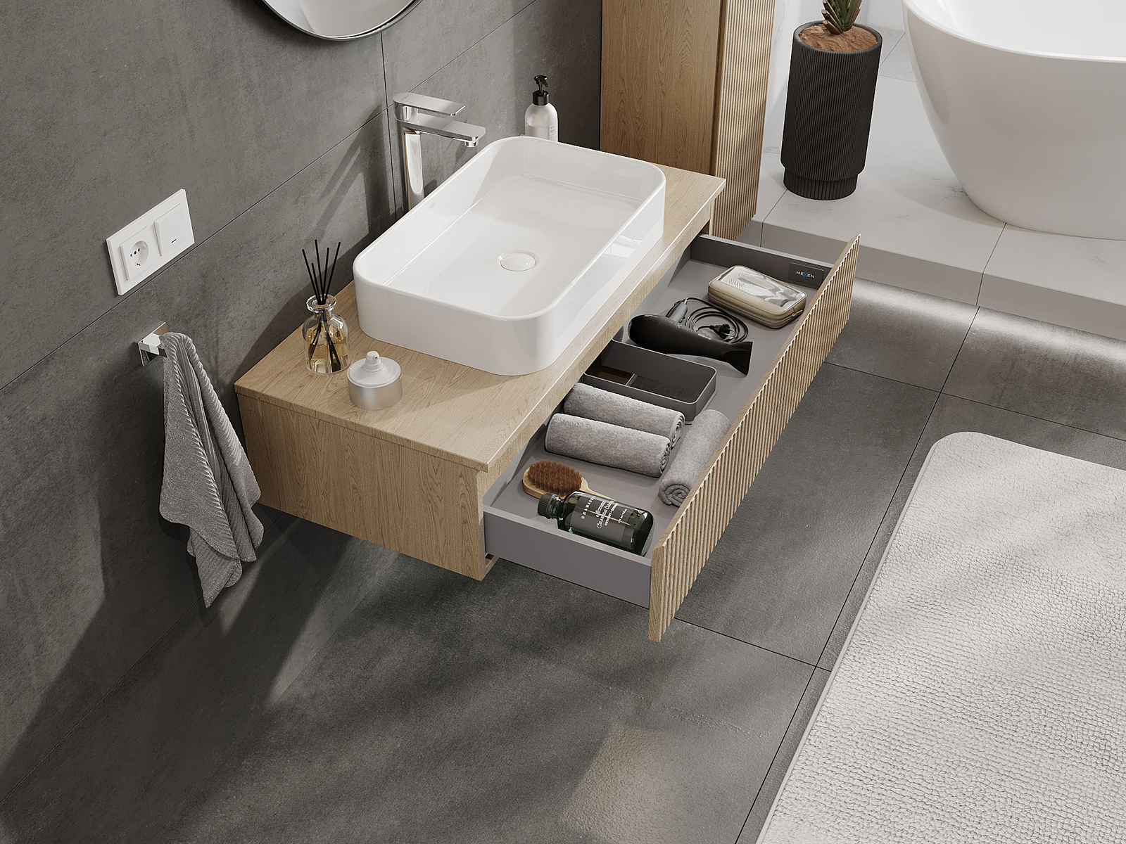 La découpe dans le tiroir est conçue de manière à accueillir le siphon, qui est nécessaire dans les installations de lavabo. Ainsi, le meuble peut être installé de manière pleinement fonctionnelle, sans devoir renoncer à l'espace du tiroir au profit de l'installation.