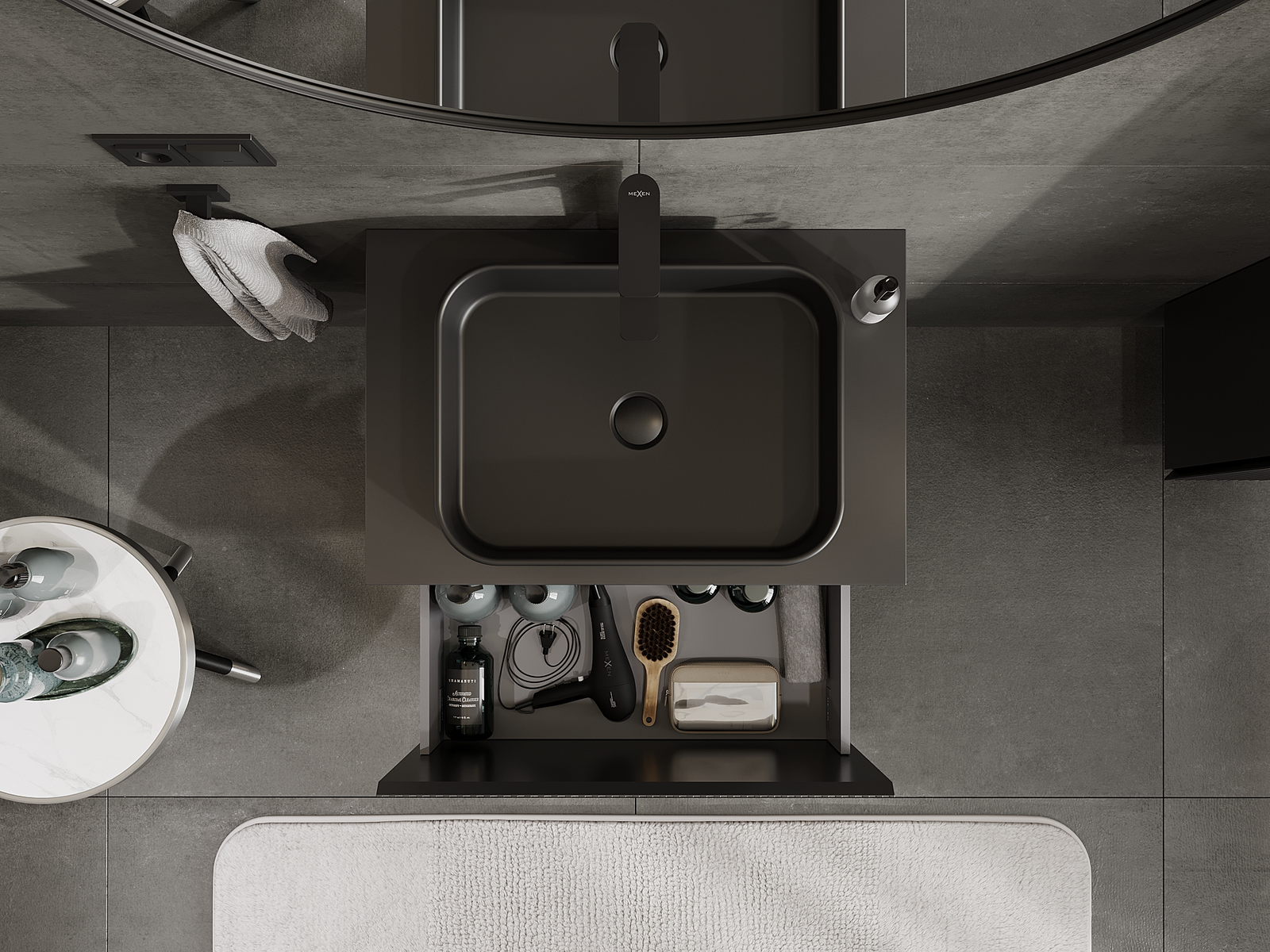 La découpe dans le tiroir est conçue de manière à accueillir le siphon, qui est nécessaire dans les installations de lavabo. Ainsi, le meuble peut être installé de manière pleinement fonctionnelle, sans devoir renoncer à l'espace du tiroir au profit de l'installation.