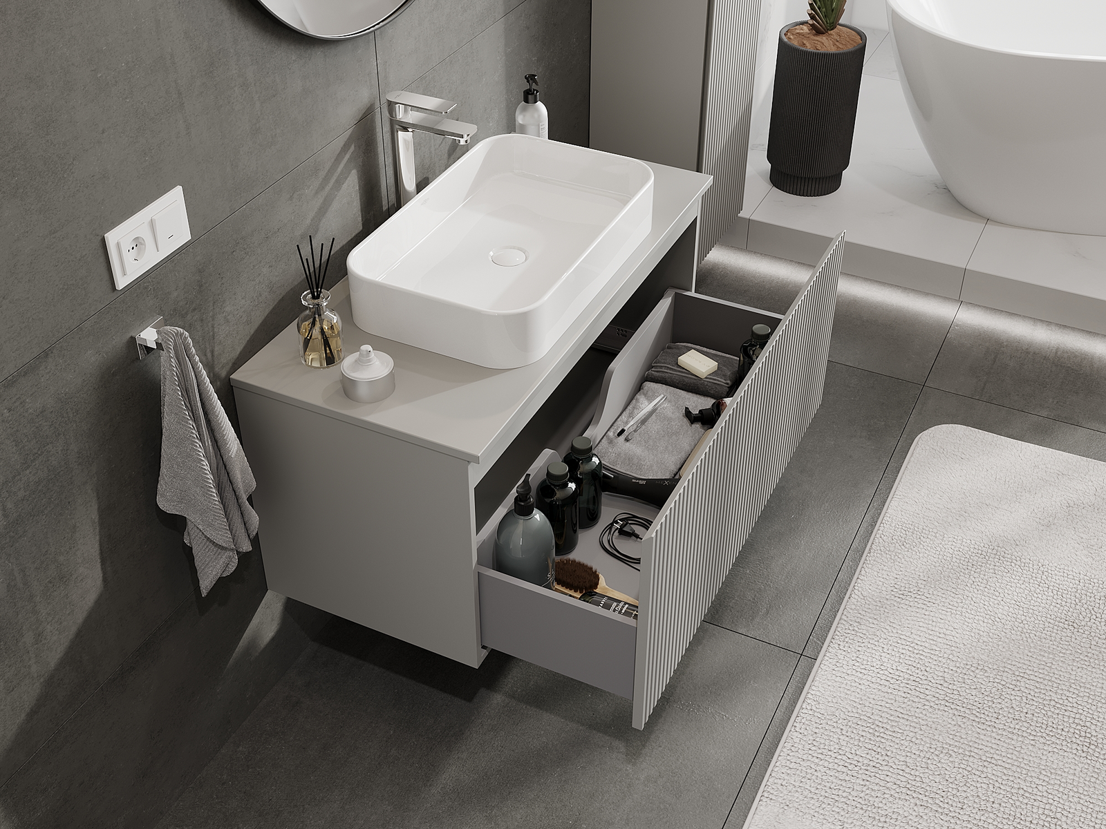 La découpe dans le tiroir est conçue de manière à accueillir le siphon, qui est nécessaire dans les installations de lavabo. Ainsi, le meuble peut être installé de manière pleinement fonctionnelle, sans devoir renoncer à l'espace du tiroir au profit de l'installation.
