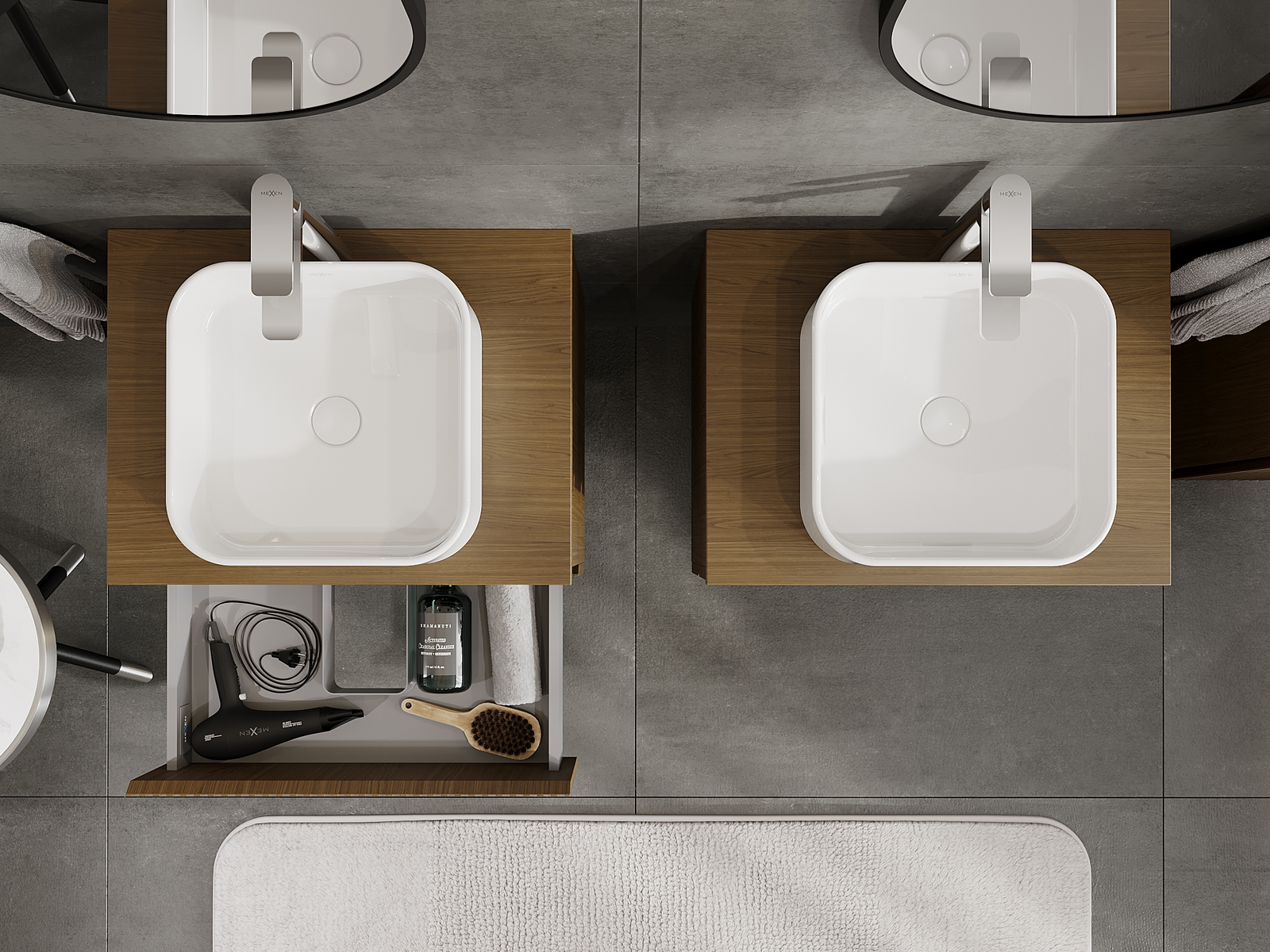 La découpe dans le tiroir est conçue de manière à accueillir le siphon, qui est nécessaire dans les installations de lavabo. Ainsi, le meuble peut être installé de manière pleinement fonctionnelle, sans devoir renoncer à l'espace du tiroir au profit de l'installation.