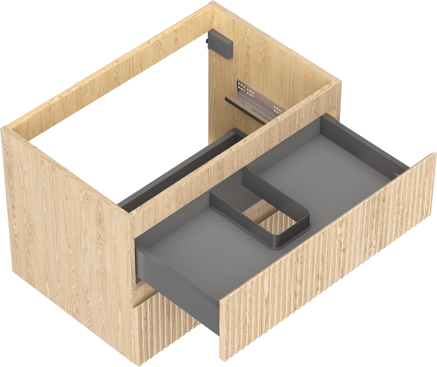 La découpe dans le tiroir est conçue de manière à accueillir le siphon, qui est nécessaire dans les installations de lavabo. Ainsi, le meuble peut être installé de manière pleinement fonctionnelle, sans devoir renoncer à l'espace du tiroir au profit de l'installation.