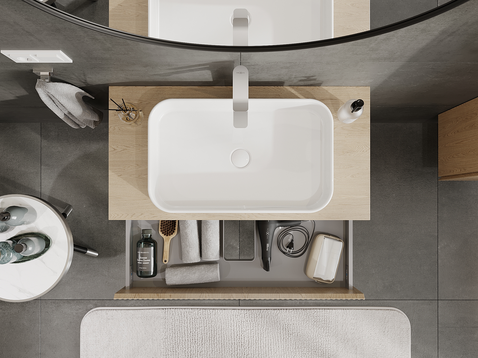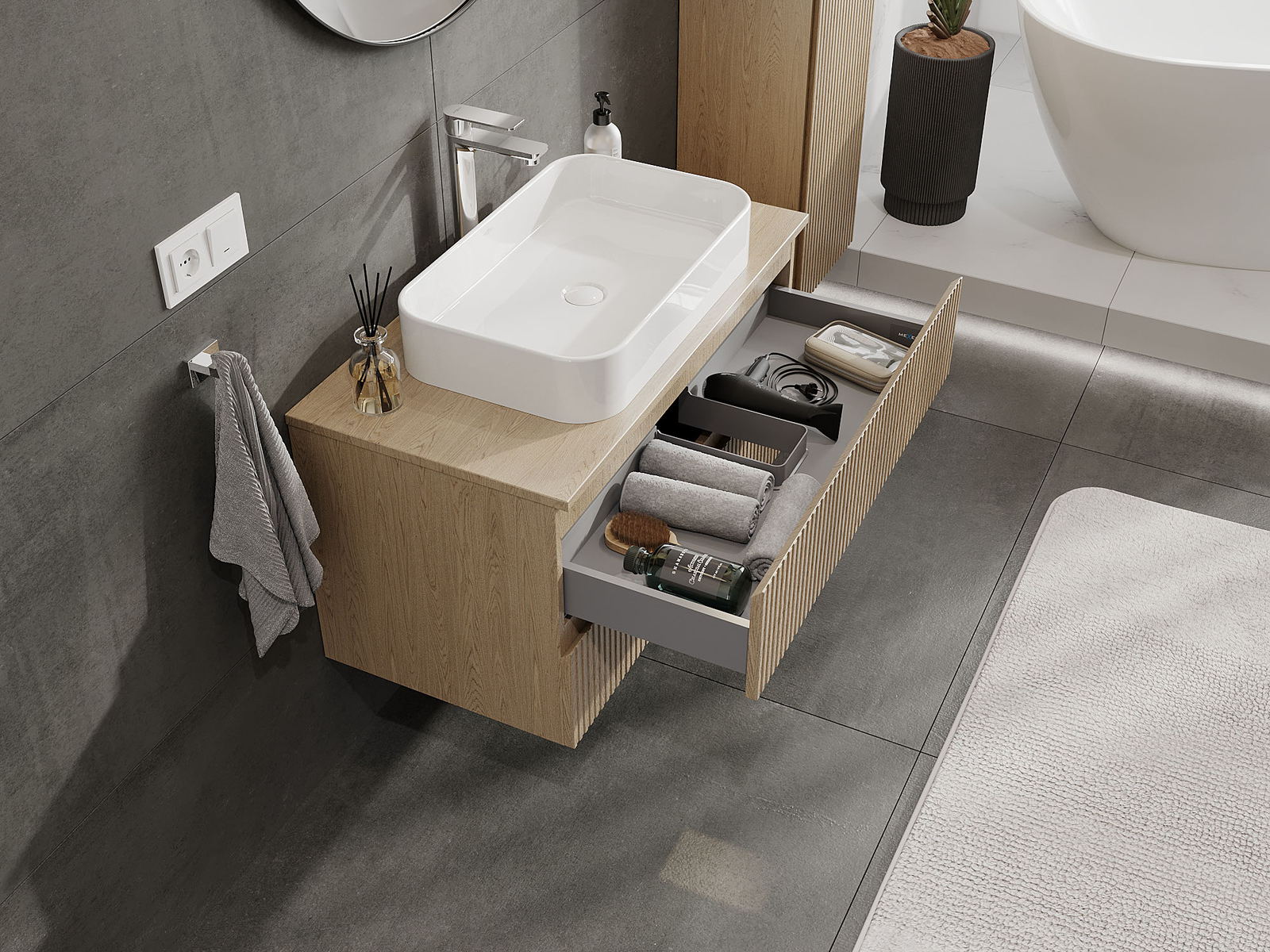 La découpe dans le tiroir est conçue de manière à accueillir le siphon, qui est nécessaire dans les installations de lavabo. Ainsi, le meuble peut être installé de manière pleinement fonctionnelle, sans devoir renoncer à l'espace du tiroir au profit de l'installation.