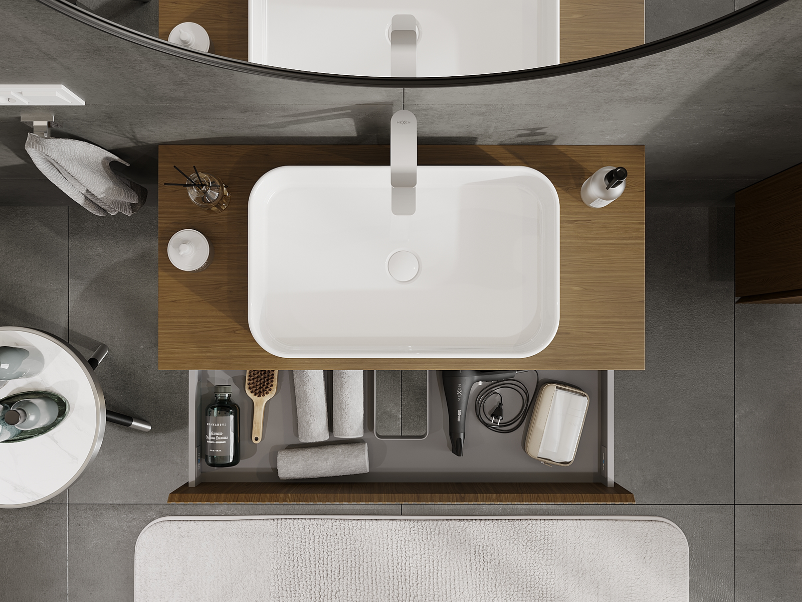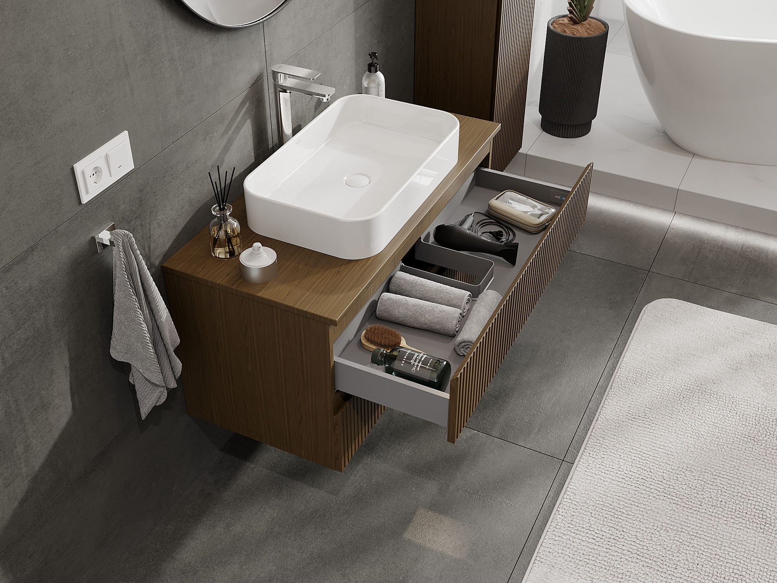 La découpe dans le tiroir est conçue de manière à accueillir le siphon, qui est nécessaire dans les installations de lavabo. Ainsi, le meuble peut être installé de manière pleinement fonctionnelle, sans devoir renoncer à l'espace du tiroir au profit de l'installation.