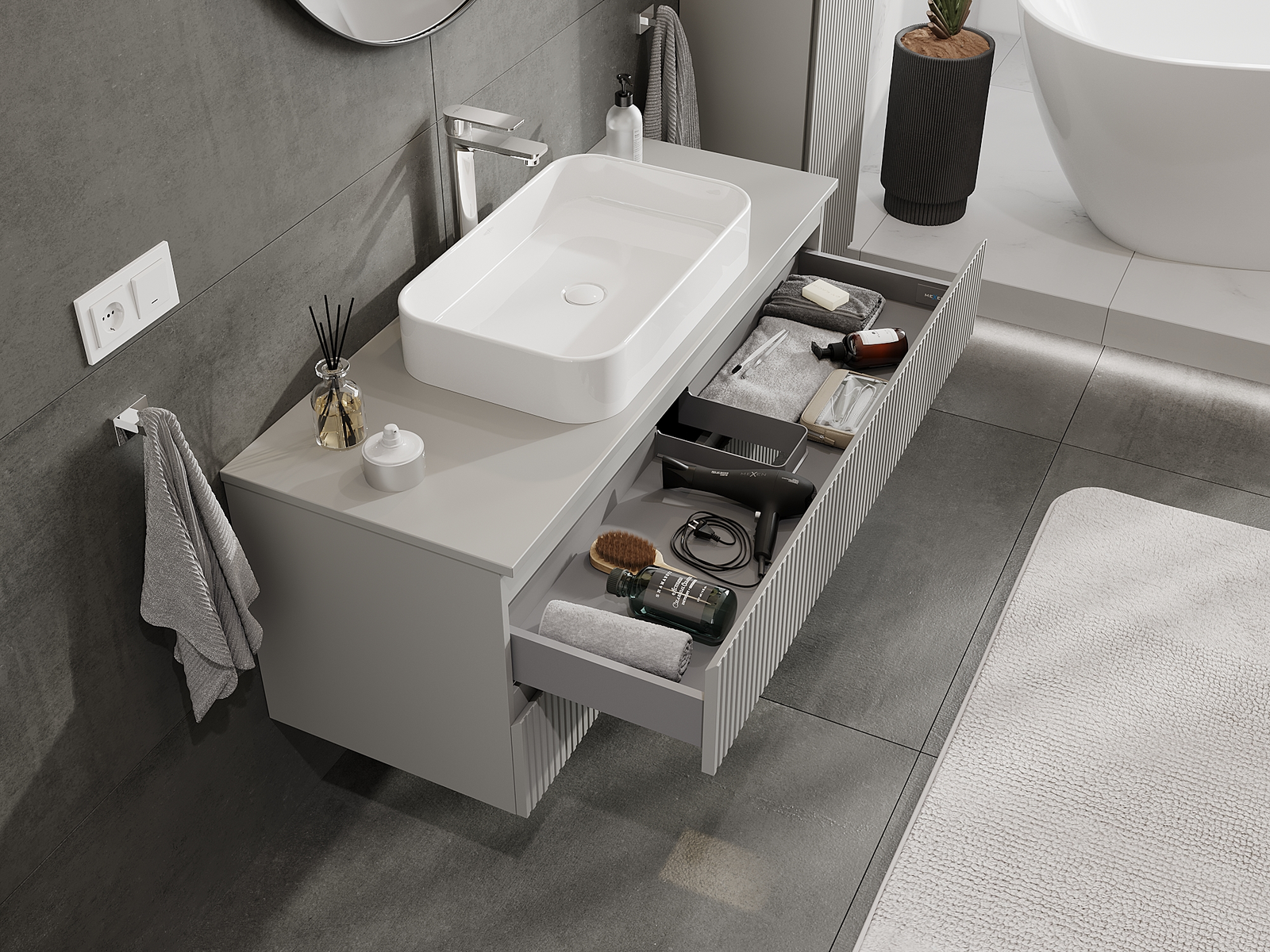 La découpe dans le tiroir est conçue de manière à accueillir le siphon, qui est nécessaire dans les installations de lavabo. Ainsi, le meuble peut être installé de manière pleinement fonctionnelle, sans devoir renoncer à l'espace du tiroir au profit de l'installation.