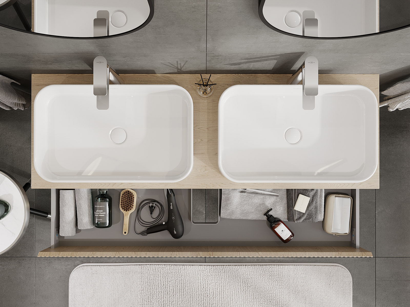 La découpe dans le tiroir est conçue de manière à accueillir le siphon, qui est nécessaire dans les installations de lavabo. Ainsi, le meuble peut être installé de manière pleinement fonctionnelle, sans devoir renoncer à l'espace du tiroir au profit de l'installation.