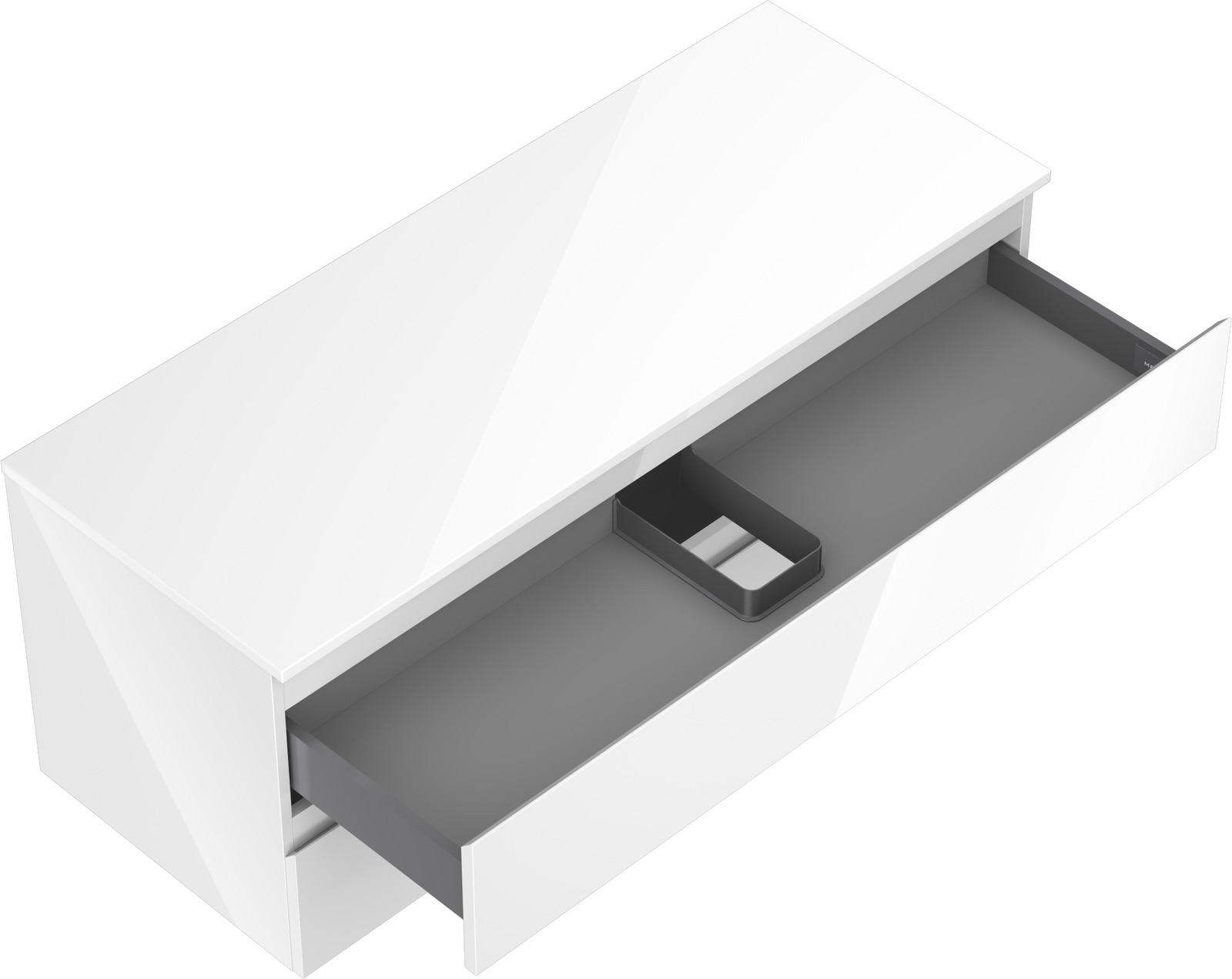 La découpe dans le tiroir est conçue de manière à accueillir le siphon, qui est nécessaire dans les installations de lavabo. Ainsi, le meuble peut être installé de manière pleinement fonctionnelle, sans devoir renoncer à l'espace du tiroir au profit de l'installation.