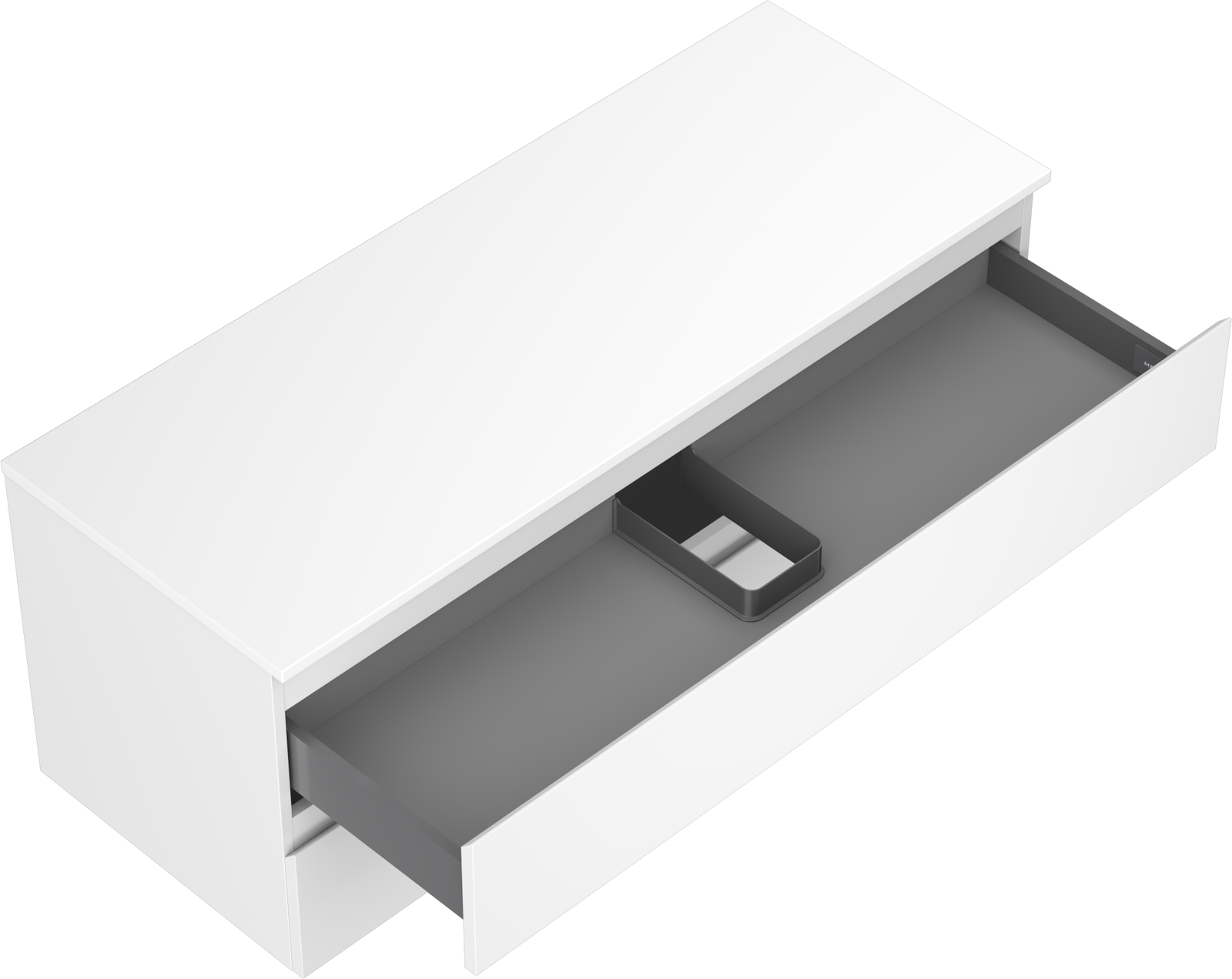 La découpe dans le tiroir est conçue de manière à accueillir le siphon, qui est nécessaire dans les installations de lavabo. Ainsi, le meuble peut être installé de manière pleinement fonctionnelle, sans devoir renoncer à l'espace du tiroir au profit de l'installation.