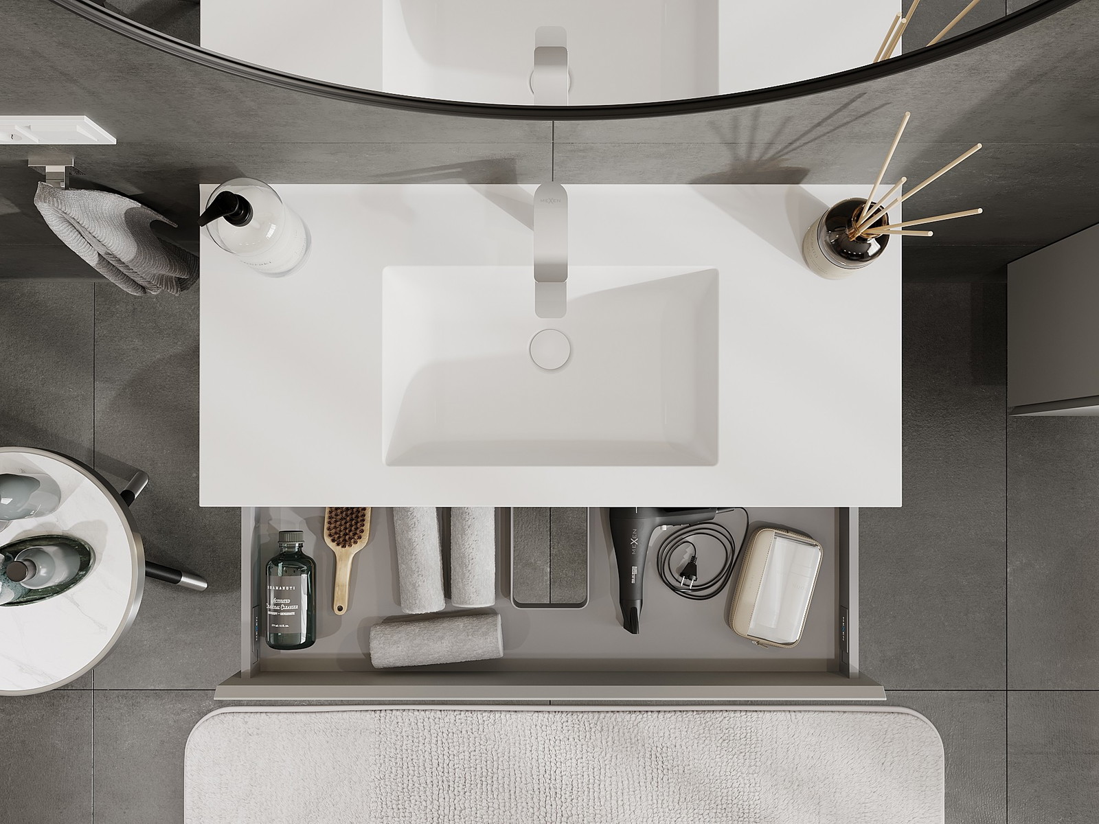 La découpe dans le tiroir est conçue de manière à accueillir le siphon, qui est nécessaire dans les installations de lavabo. Ainsi, le meuble peut être installé de manière pleinement fonctionnelle, sans devoir renoncer à l'espace du tiroir au profit de l'installation.