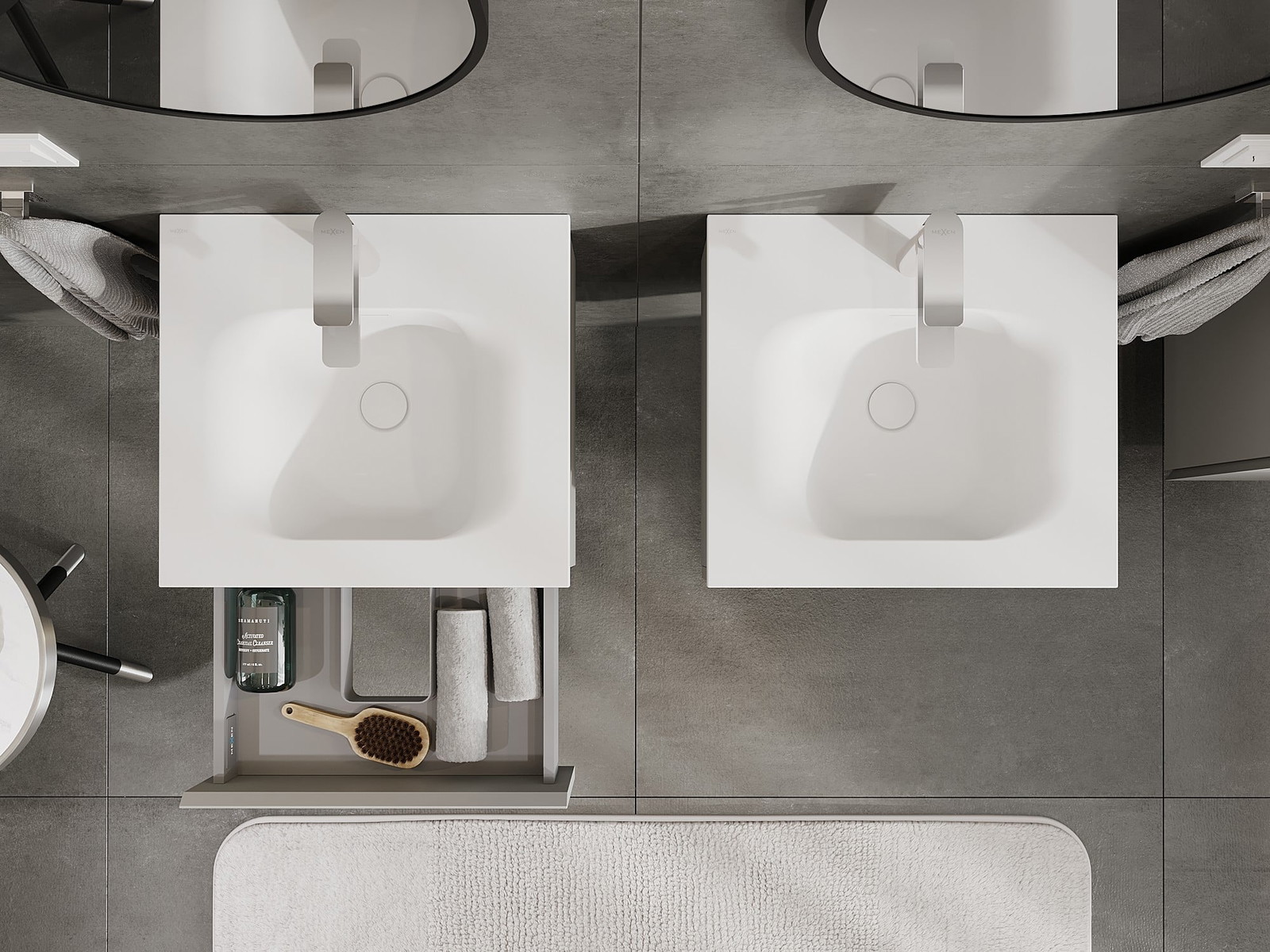 La découpe dans le tiroir est conçue de manière à accueillir le siphon, qui est nécessaire dans les installations de lavabo. Ainsi, le meuble peut être installé de manière pleinement fonctionnelle, sans devoir renoncer à l'espace du tiroir au profit de l'installation.