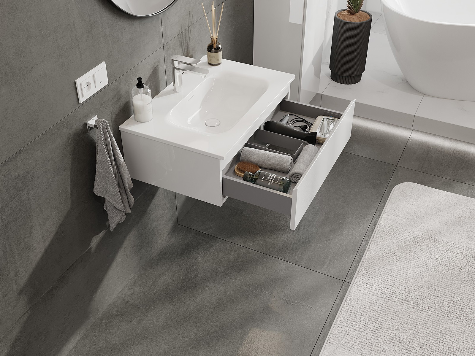 La découpe dans le tiroir est conçue de manière à accueillir le siphon, qui est nécessaire dans les installations de lavabo. Ainsi, le meuble peut être installé de manière pleinement fonctionnelle, sans devoir renoncer à l'espace du tiroir au profit de l'installation.
