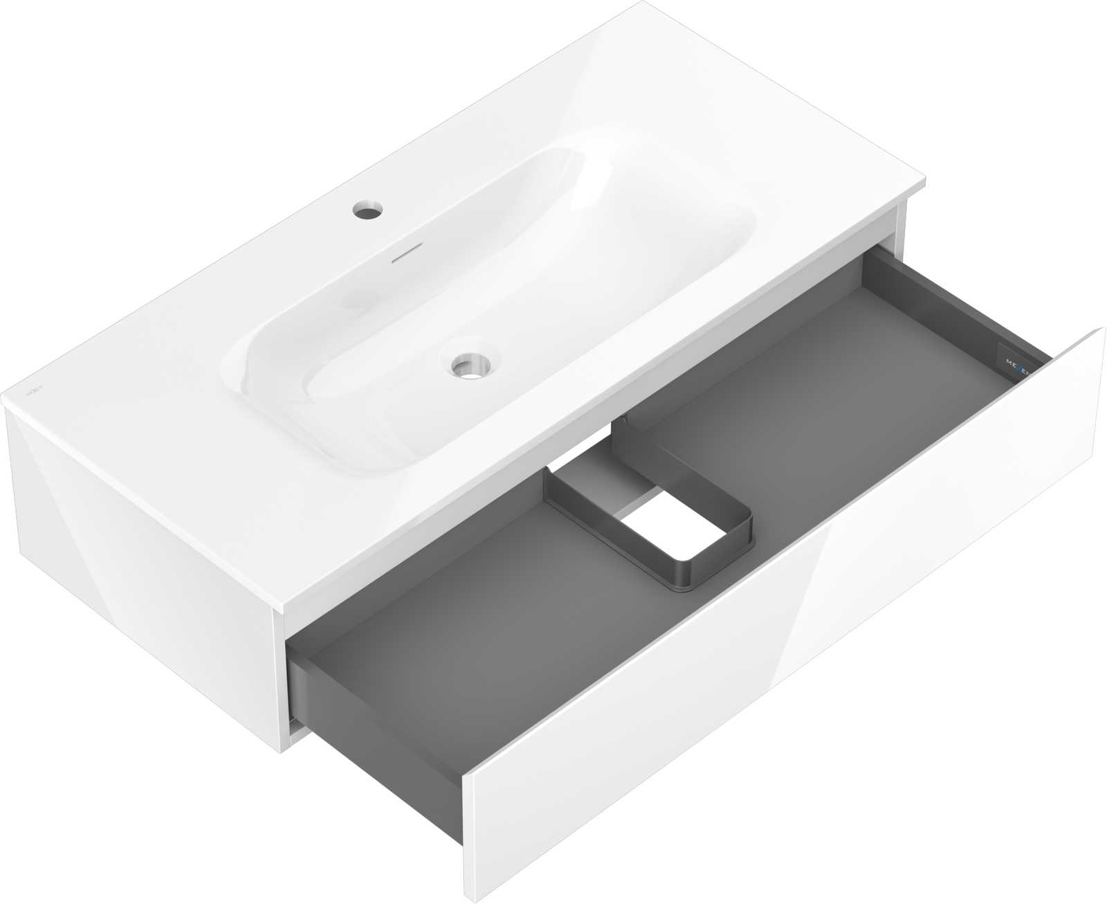 La découpe dans le tiroir est conçue de manière à accueillir le siphon, qui est nécessaire dans les installations de lavabo. Ainsi, le meuble peut être installé de manière pleinement fonctionnelle, sans devoir renoncer à l'espace du tiroir au profit de l'installation.
