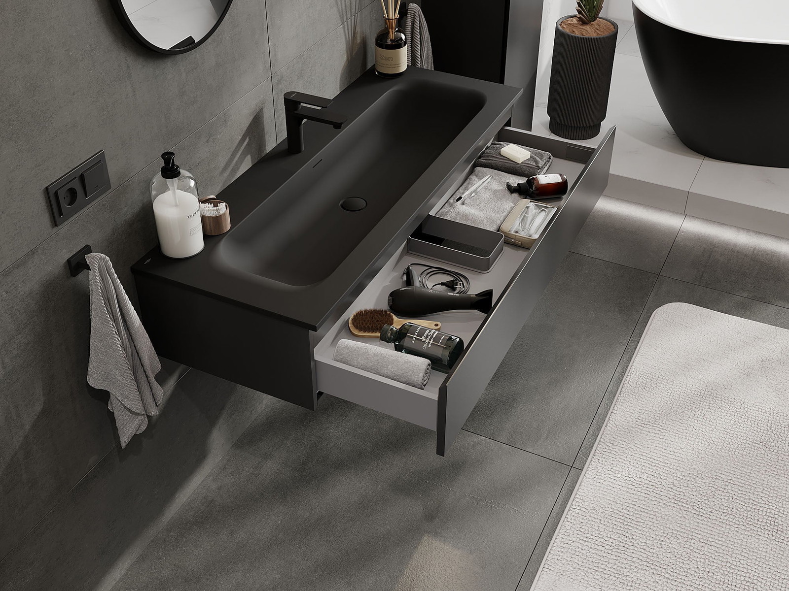 La découpe dans le tiroir est conçue de manière à accueillir le siphon, qui est nécessaire dans les installations de lavabo. Ainsi, le meuble peut être installé de manière pleinement fonctionnelle, sans devoir renoncer à l'espace du tiroir au profit de l'installation.