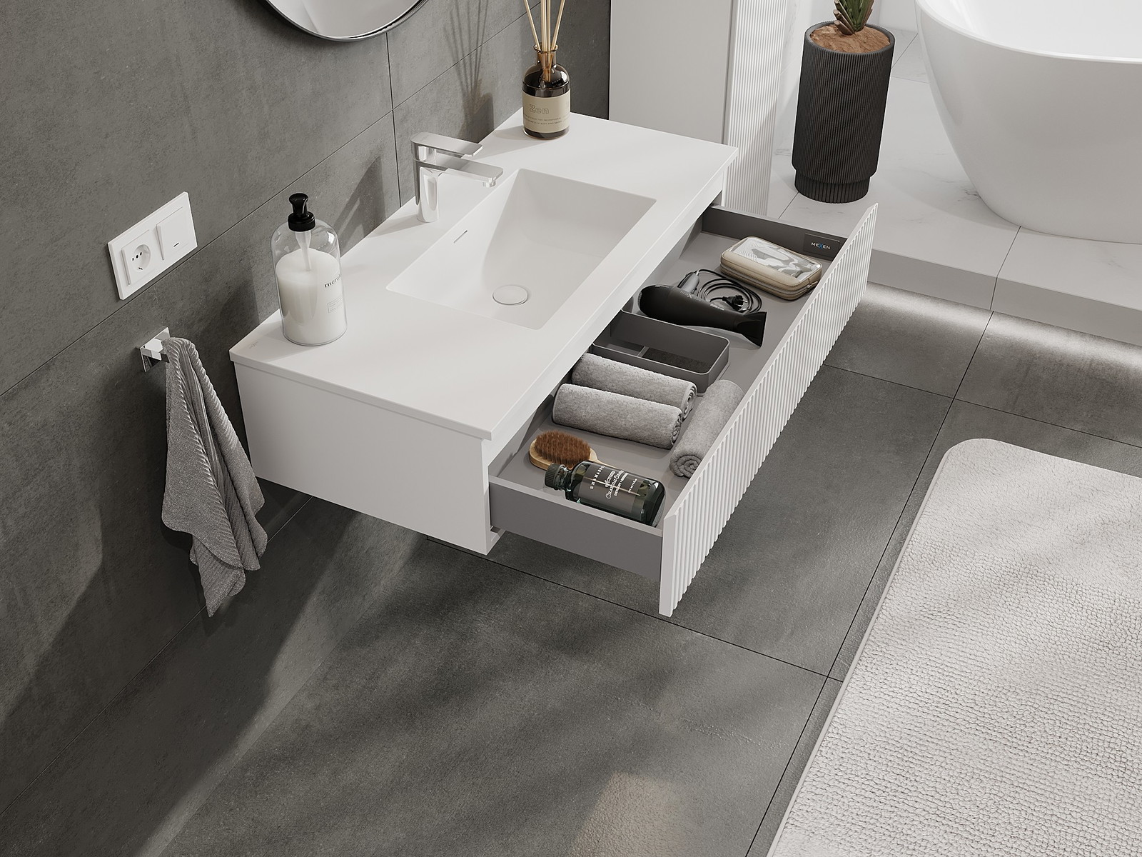 Mexen Rivel meuble de salle de bain 100 cm avec lavabo Otis, 1 tiroir, rainuré, blanc mat - 91A20-10023-1-BF01-W18M01
