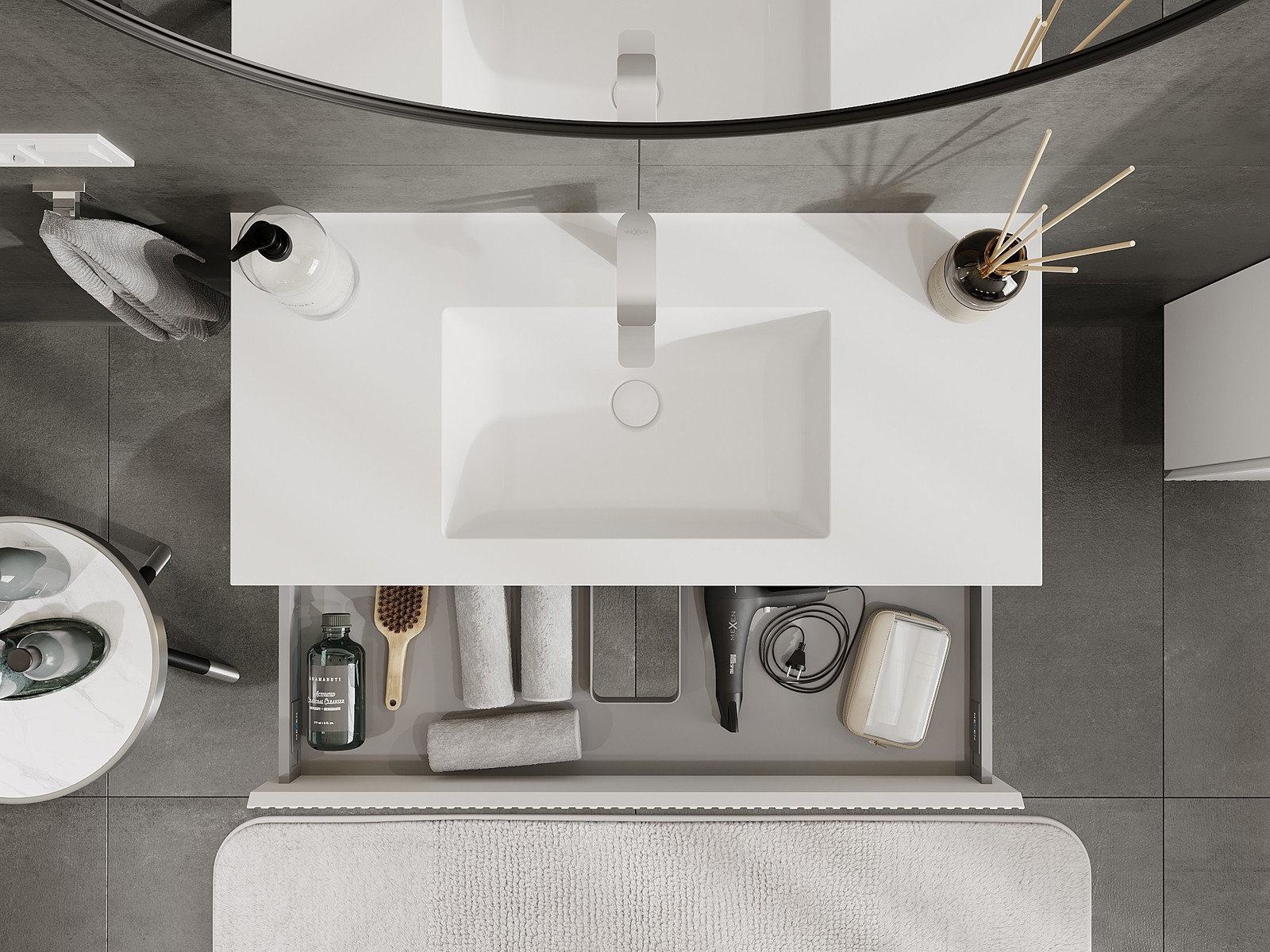 La découpe dans le tiroir est conçue de manière à accueillir le siphon, qui est nécessaire dans les installations de lavabo. Ainsi, le meuble peut être installé de manière pleinement fonctionnelle, sans devoir renoncer à l'espace du tiroir au profit de l'installation.