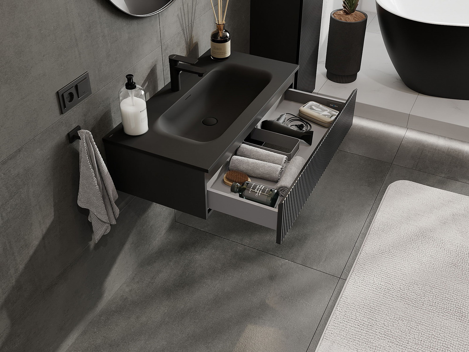 La découpe dans le tiroir est conçue de manière à accueillir le siphon, qui est nécessaire dans les installations de lavabo. Ainsi, le meuble peut être installé de manière pleinement fonctionnelle, sans devoir renoncer à l'espace du tiroir au profit de l'installation.