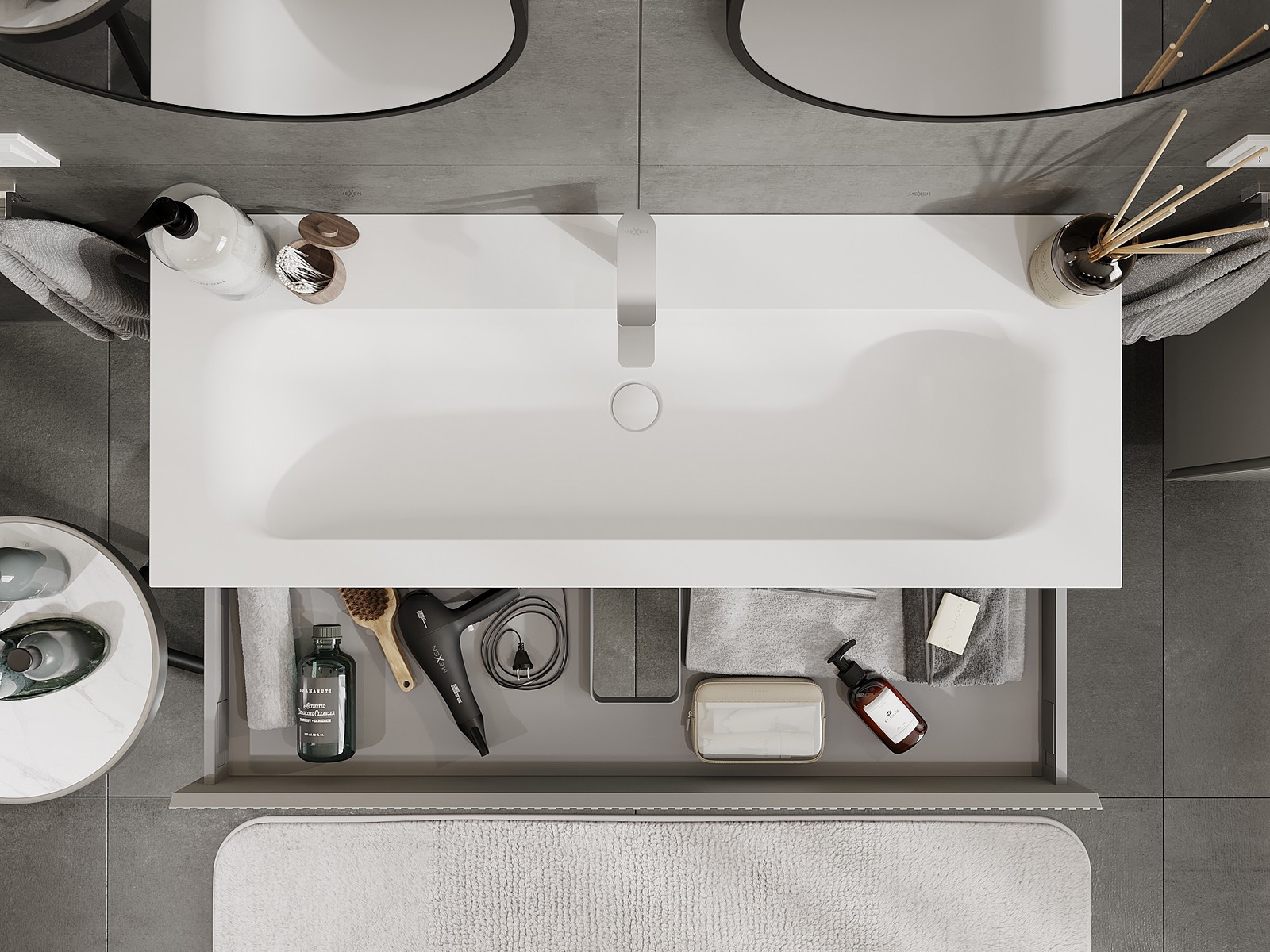 La découpe dans le tiroir est conçue de manière à accueillir le siphon, qui est nécessaire dans les installations de lavabo. Ainsi, le meuble peut être installé de manière pleinement fonctionnelle, sans devoir renoncer à l'espace du tiroir au profit de l'installation.