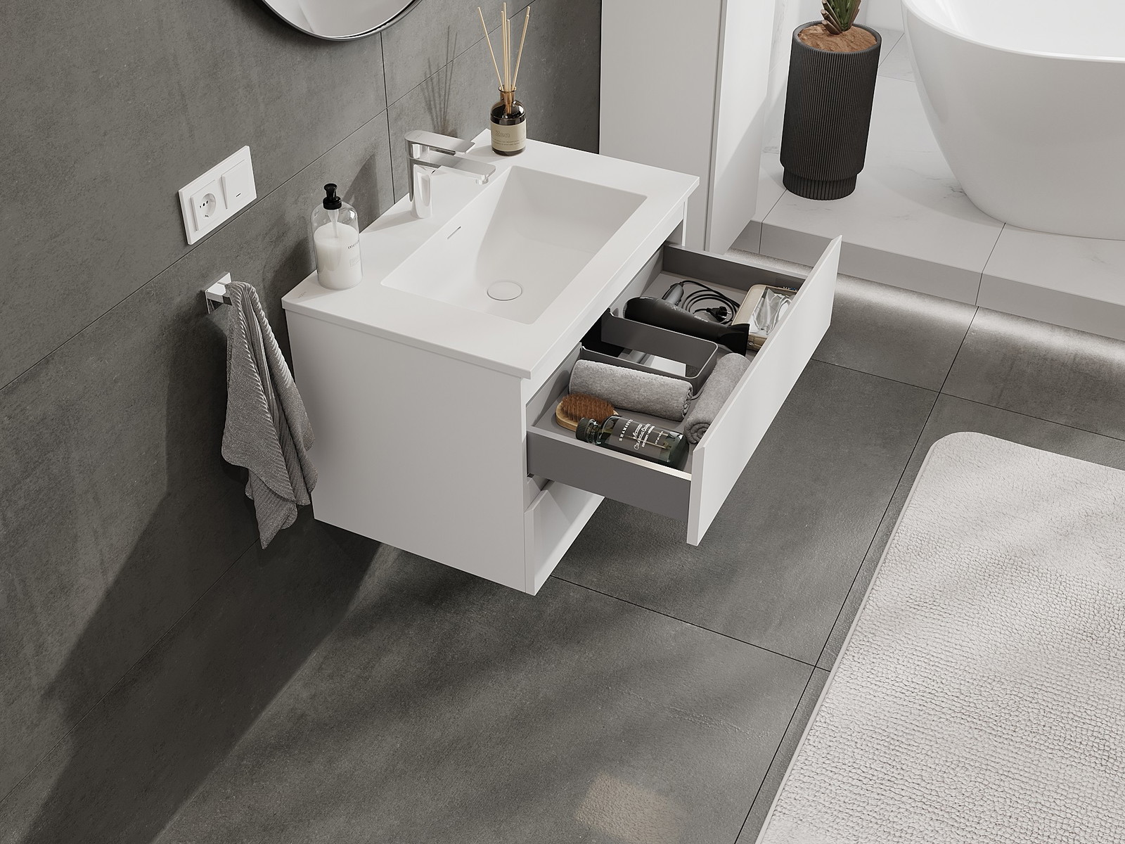 La découpe dans le tiroir est conçue de manière à accueillir le siphon, qui est nécessaire dans les installations de lavabo. Ainsi, le meuble peut être installé de manière pleinement fonctionnelle, sans devoir renoncer à l'espace du tiroir au profit de l'installation.