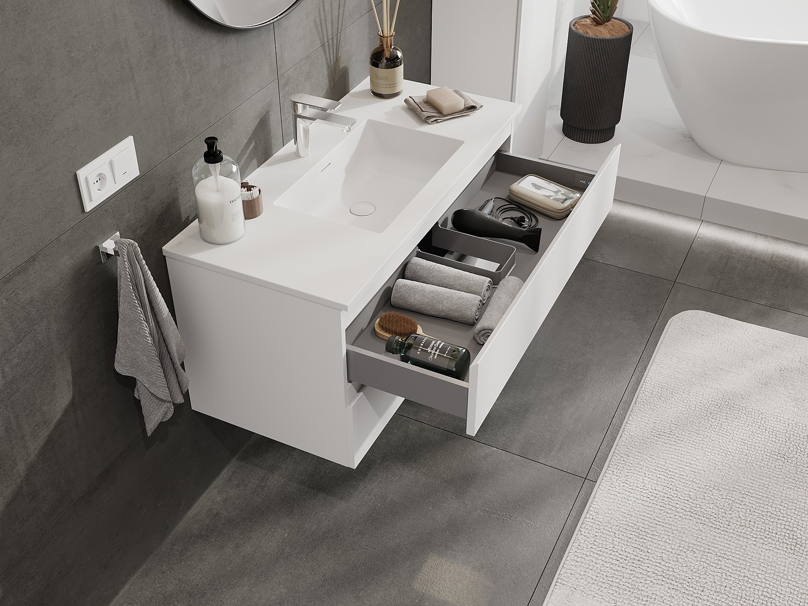 La découpe dans le tiroir est conçue de manière à accueillir le siphon, qui est nécessaire dans les installations de lavabo. Ainsi, le meuble peut être installé de manière pleinement fonctionnelle, sans devoir renoncer à l'espace du tiroir au profit de l'installation.