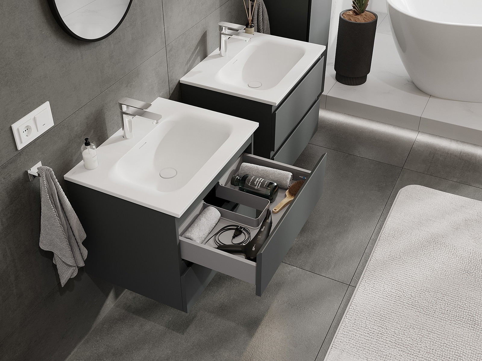 La découpe dans le tiroir est conçue de manière à accueillir le siphon, qui est nécessaire dans les installations de lavabo. Ainsi, le meuble peut être installé de manière pleinement fonctionnelle, sans devoir renoncer à l'espace du tiroir au profit de l'installation.
