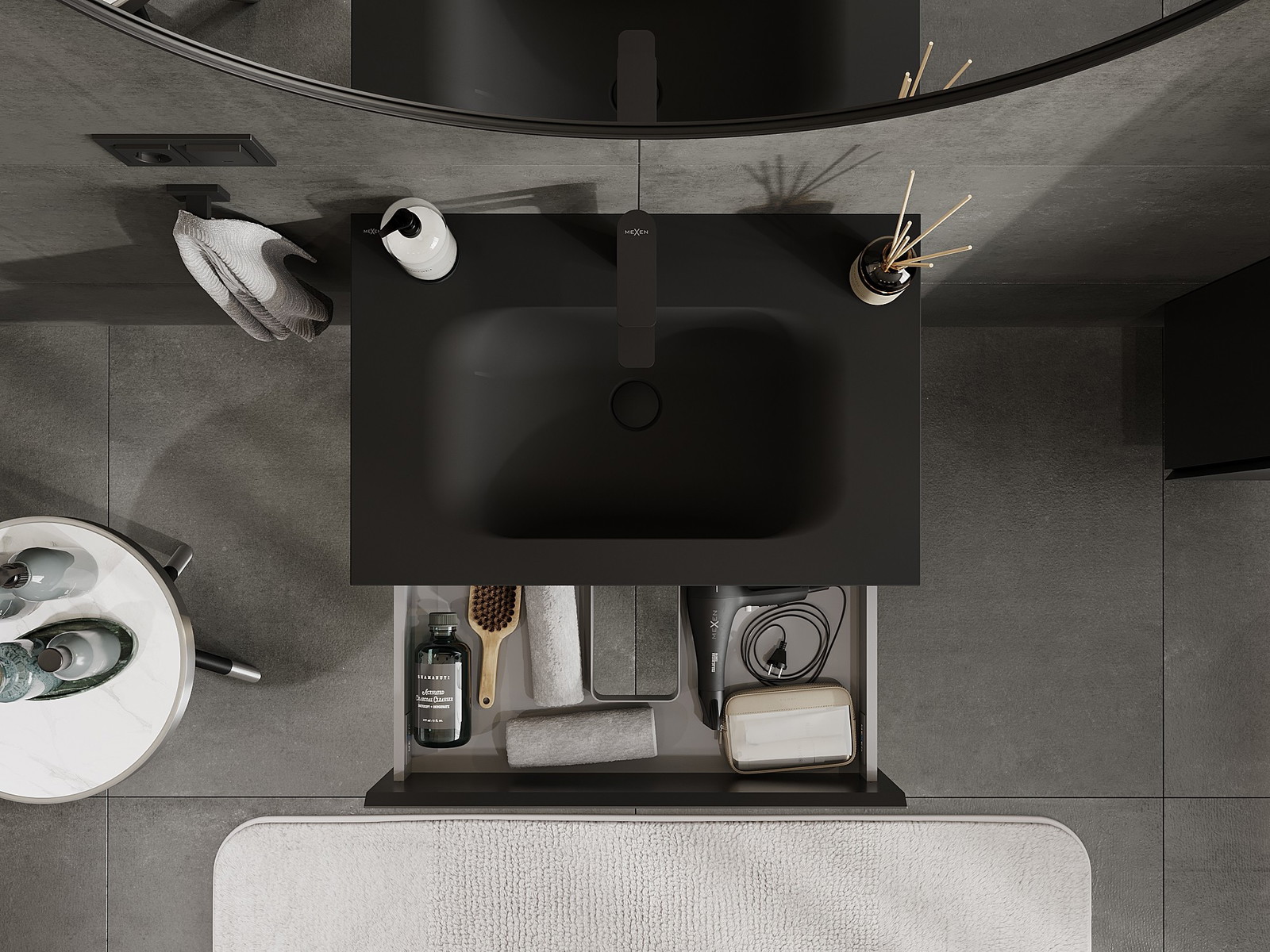 La découpe dans le tiroir est conçue de manière à accueillir le siphon, qui est nécessaire dans les installations de lavabo. Ainsi, le meuble peut être installé de manière pleinement fonctionnelle, sans devoir renoncer à l'espace du tiroir au profit de l'installation.