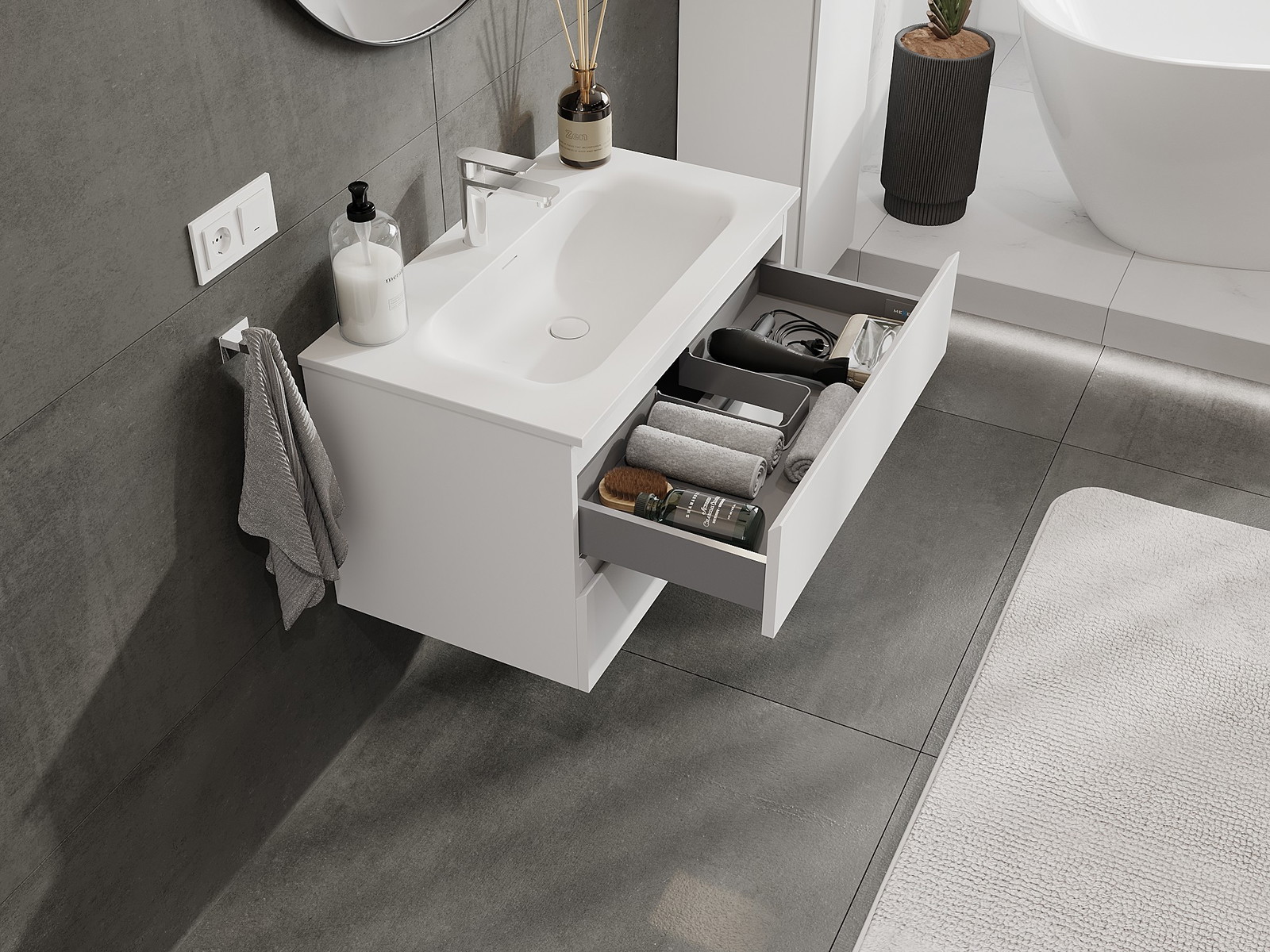 La découpe dans le tiroir est conçue de manière à accueillir le siphon, qui est nécessaire dans les installations de lavabo. Ainsi, le meuble peut être installé de manière pleinement fonctionnelle, sans devoir renoncer à l'espace du tiroir au profit de l'installation.