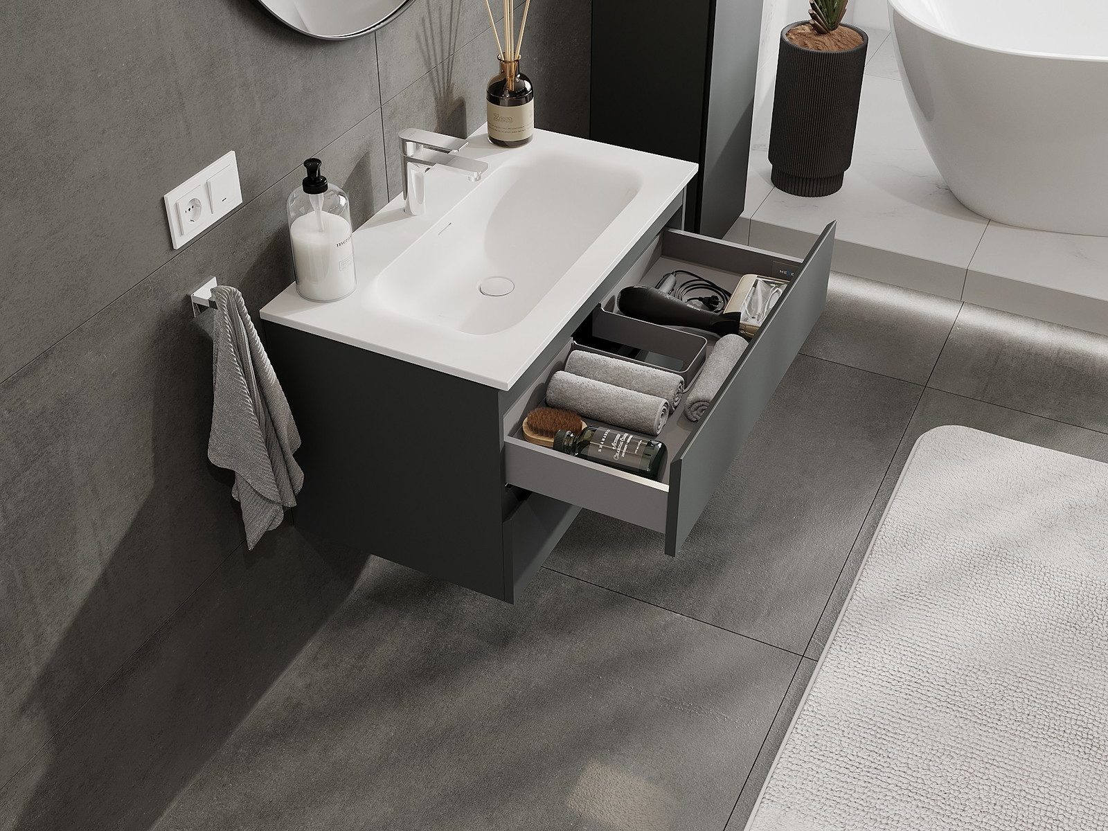 La découpe dans le tiroir est conçue de manière à accueillir le siphon, qui est nécessaire dans les installations de lavabo. Ainsi, le meuble peut être installé de manière pleinement fonctionnelle, sans devoir renoncer à l'espace du tiroir au profit de l'installation.