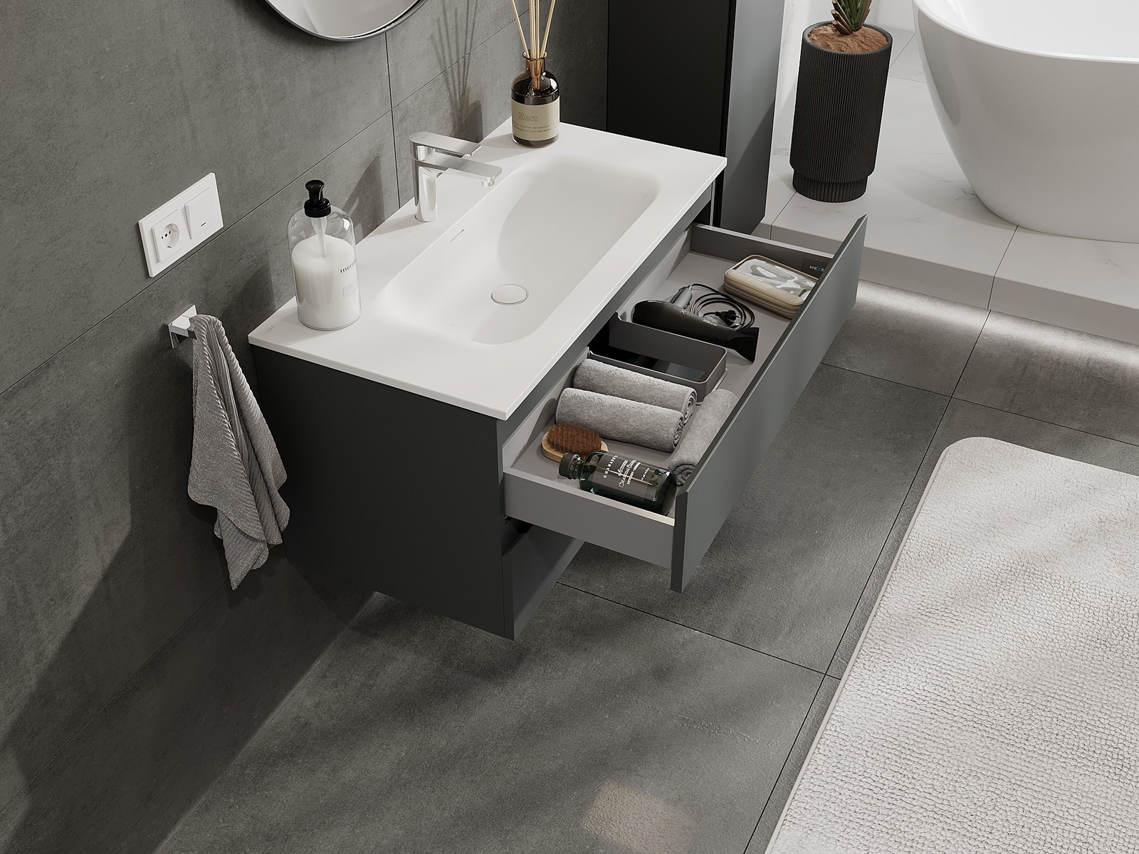 La découpe dans le tiroir est conçue de manière à accueillir le siphon, qui est nécessaire dans les installations de lavabo. Ainsi, le meuble peut être installé de manière pleinement fonctionnelle, sans devoir renoncer à l'espace du tiroir au profit de l'installation.