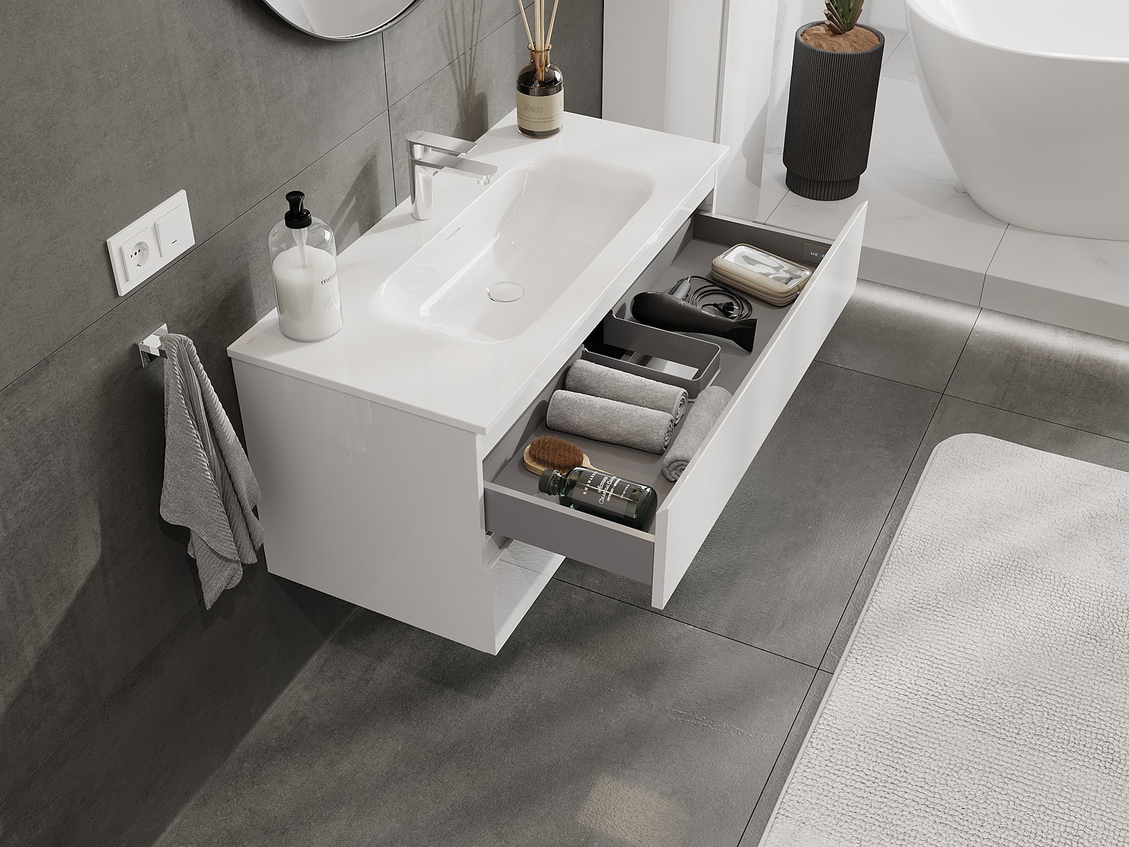 La découpe dans le tiroir est conçue de manière à accueillir le siphon, qui est nécessaire dans les installations de lavabo. Ainsi, le meuble peut être installé de manière pleinement fonctionnelle, sans devoir renoncer à l'espace du tiroir au profit de l'installation.