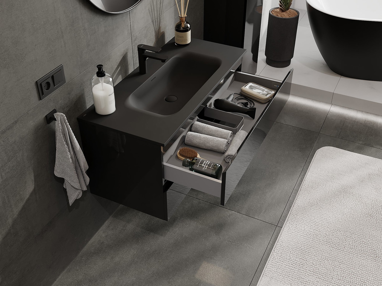 La découpe dans le tiroir est conçue de manière à accueillir le siphon, qui est nécessaire dans les installations de lavabo. Ainsi, le meuble peut être installé de manière pleinement fonctionnelle, sans devoir renoncer à l'espace du tiroir au profit de l'installation.