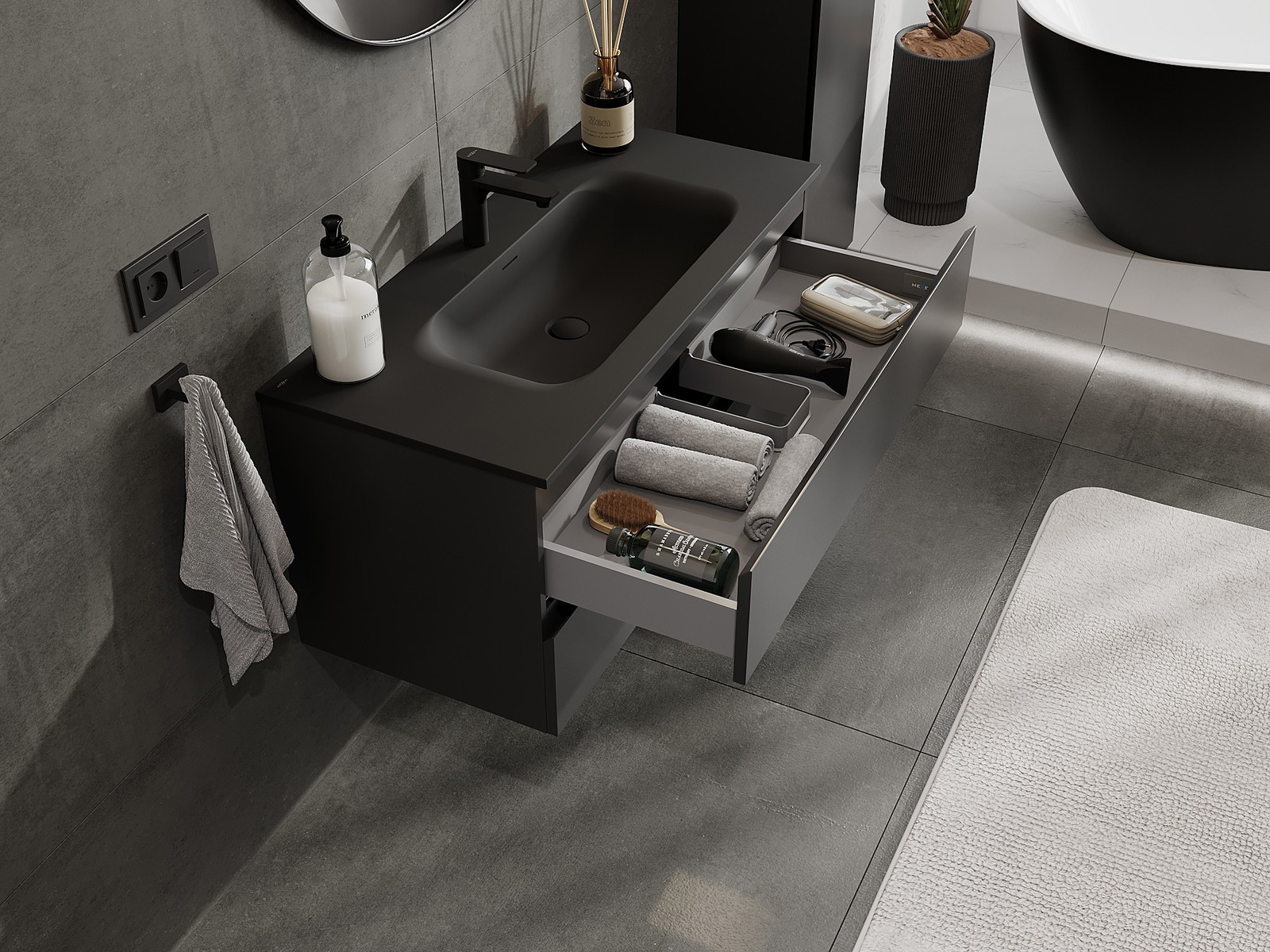 La découpe dans le tiroir est conçue de manière à accueillir le siphon, qui est nécessaire dans les installations de lavabo. Ainsi, le meuble peut être installé de manière pleinement fonctionnelle, sans devoir renoncer à l'espace du tiroir au profit de l'installation.