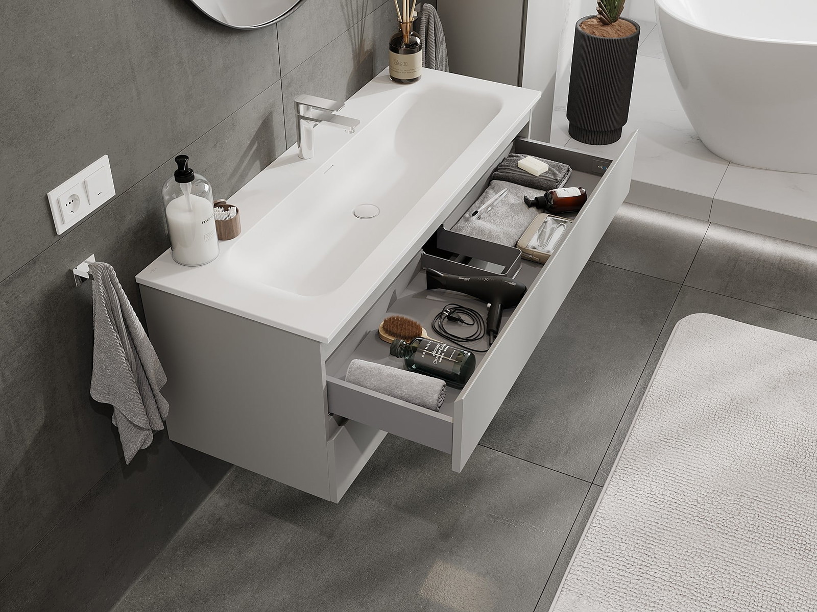 La découpe dans le tiroir est conçue de manière à accueillir le siphon, qui est nécessaire dans les installations de lavabo. Ainsi, le meuble peut être installé de manière pleinement fonctionnelle, sans devoir renoncer à l'espace du tiroir au profit de l'installation.