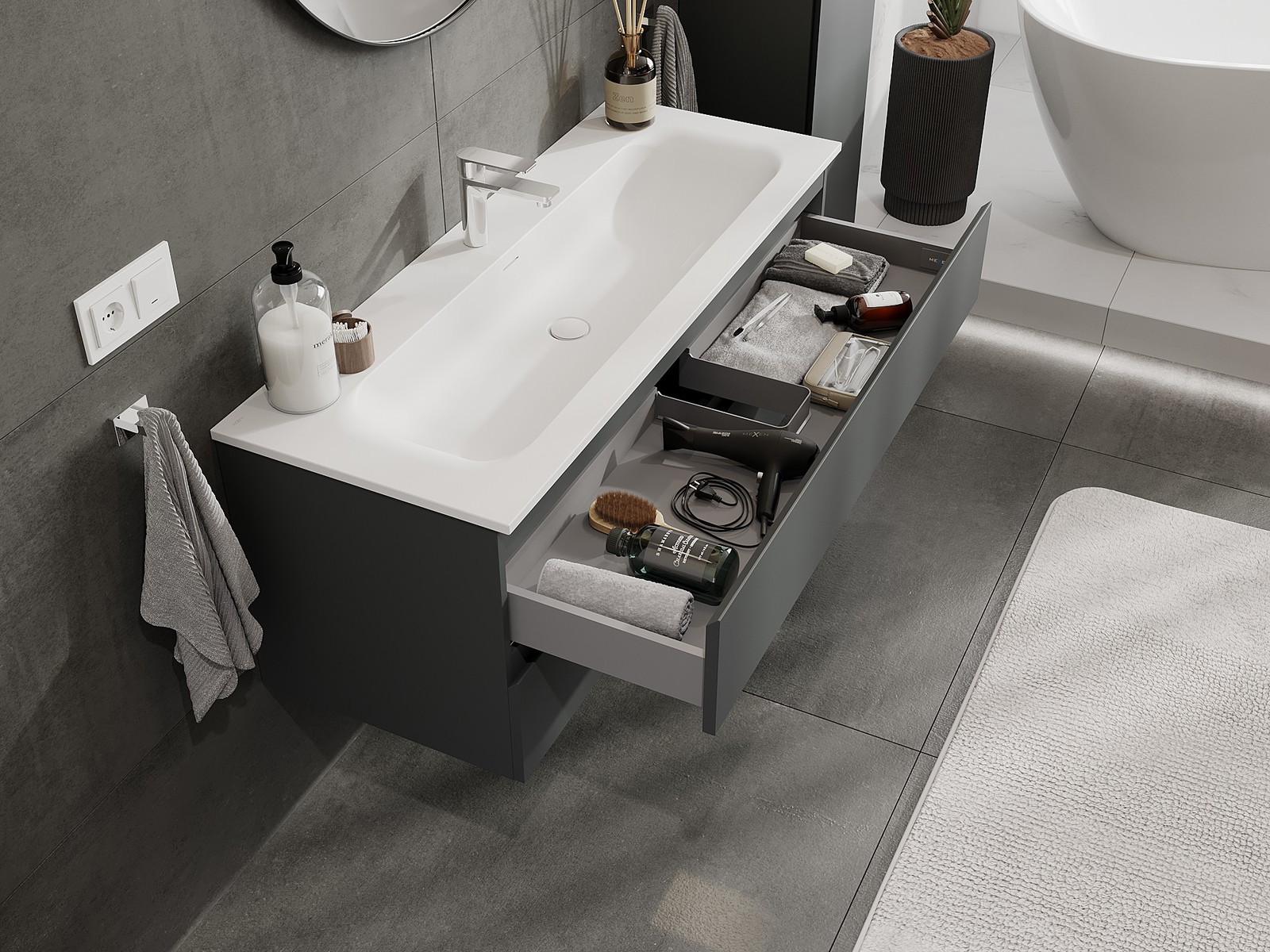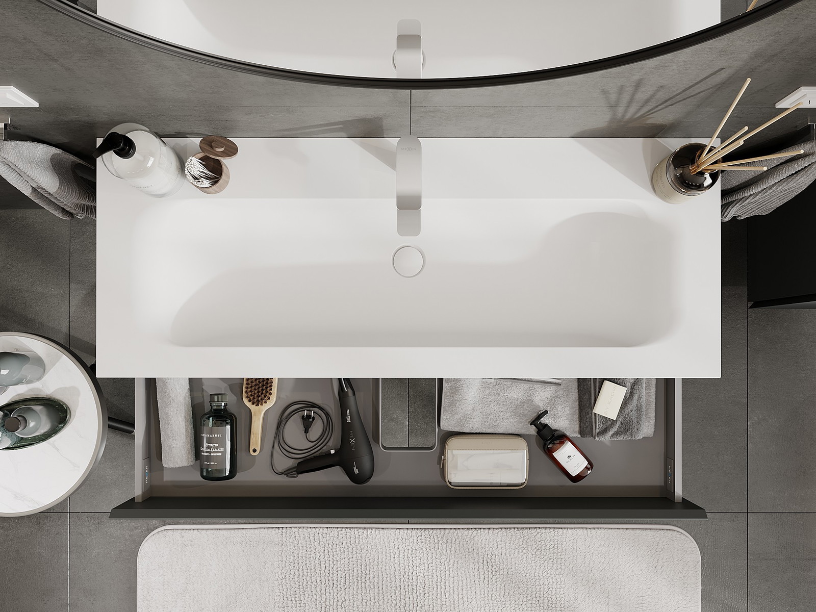La découpe dans le tiroir est conçue de manière à accueillir le siphon, qui est nécessaire dans les installations de lavabo. Ainsi, le meuble peut être installé de manière pleinement fonctionnelle, sans devoir renoncer à l'espace du tiroir au profit de l'installation.