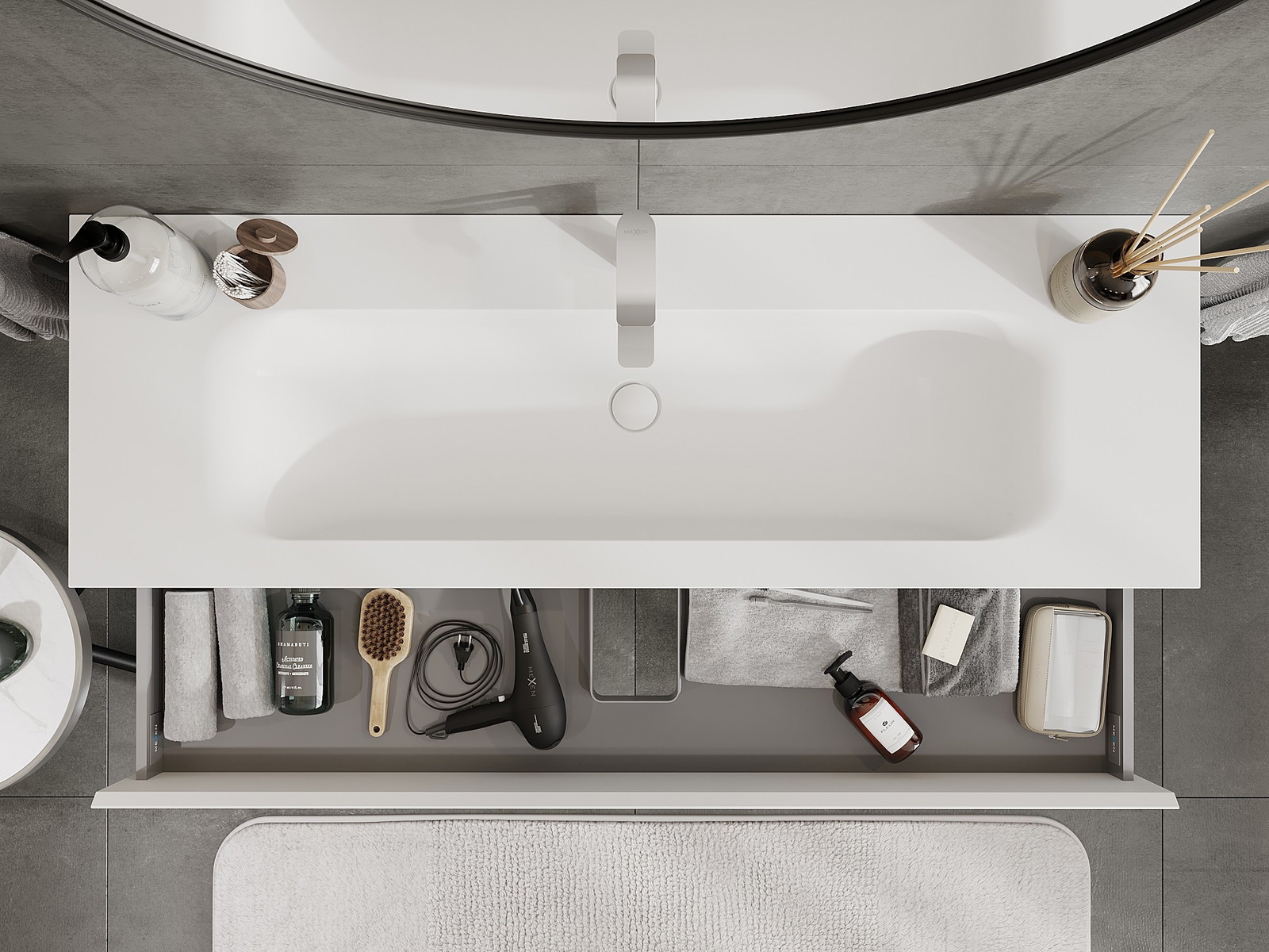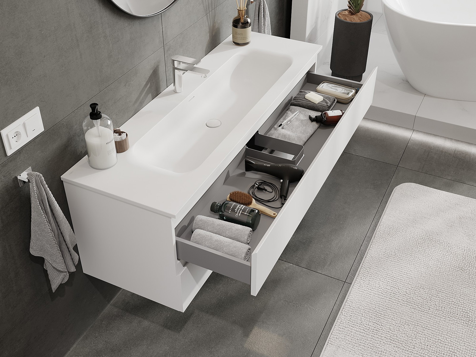 La découpe dans le tiroir est conçue de manière à accueillir le siphon, qui est nécessaire dans les installations de lavabo. Ainsi, le meuble peut être installé de manière pleinement fonctionnelle, sans devoir renoncer à l'espace du tiroir au profit de l'installation.