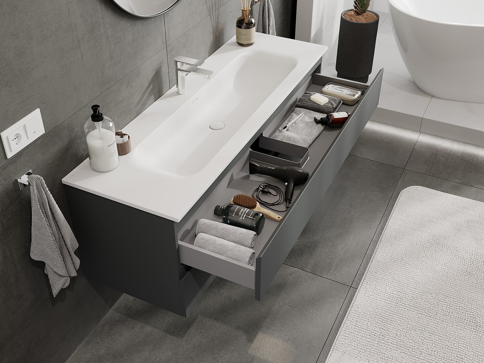 La découpe dans le tiroir est conçue de manière à accueillir le siphon, qui est nécessaire dans les installations de lavabo. Ainsi, le meuble peut être installé de manière pleinement fonctionnelle, sans devoir renoncer à l'espace du tiroir au profit de l'installation.