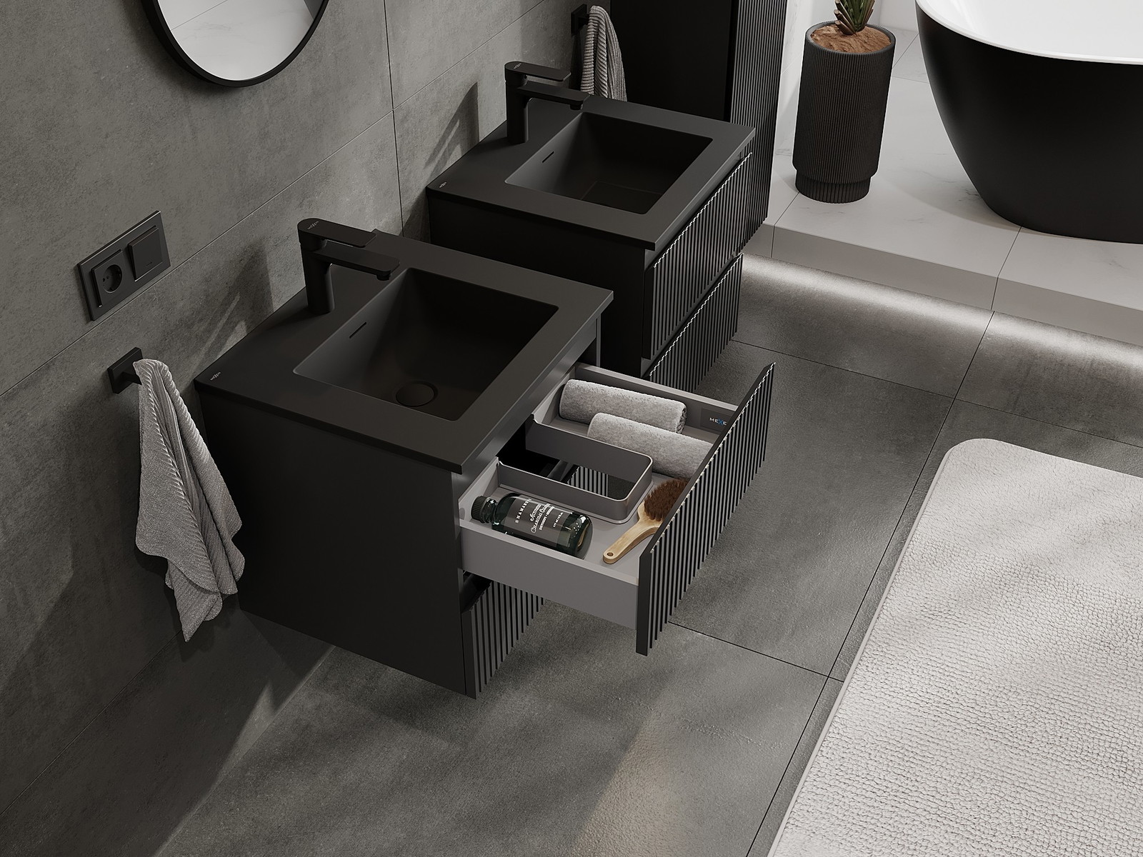 Mexen Rivel meuble de salle de bains 50 cm avec lavabo Otis, 2 tiroirs, rainuré, noir mat - 91A20-05047-2-BFF71-W18M71