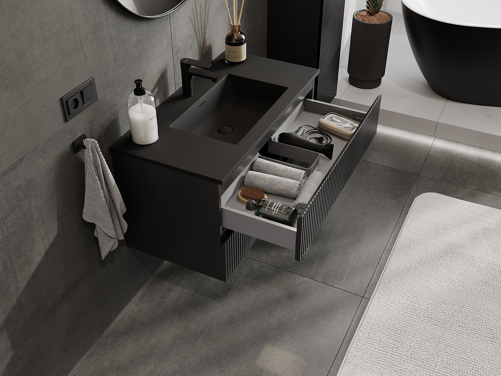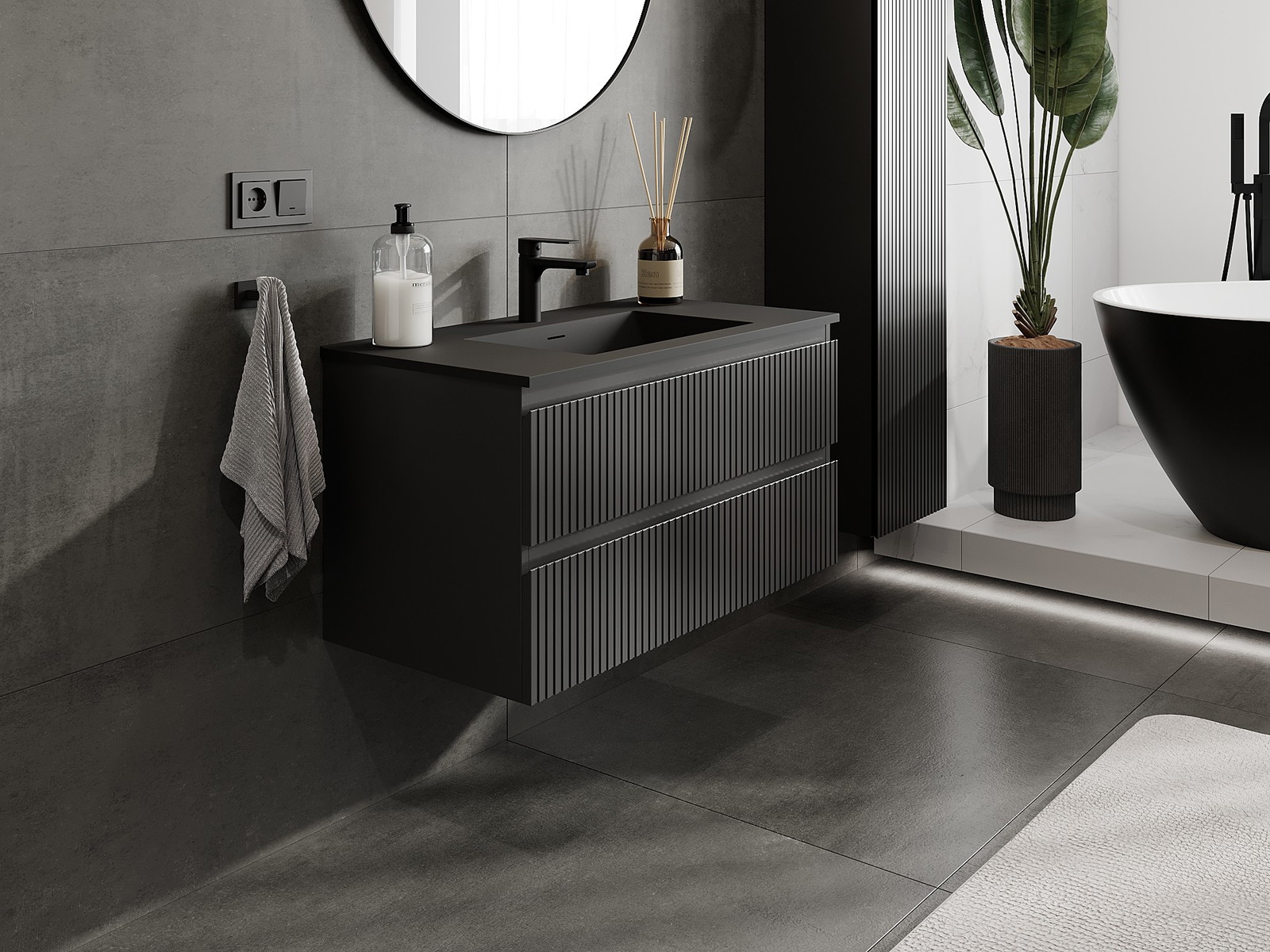 Mexen Rivel meuble de salle de bain 90 cm avec lavabo Otis, 2 tiroirs, rainuré, noir mat - 91A20-09047-2-BFF71-W18M71