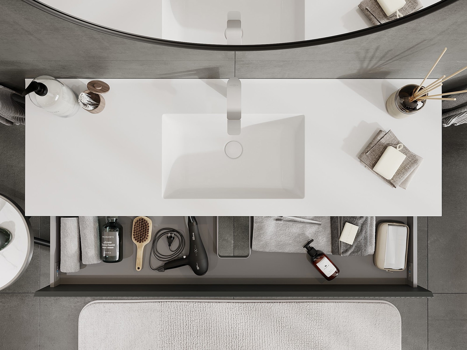 La découpe dans le tiroir est conçue de manière à accueillir le siphon, qui est nécessaire dans les installations de lavabo. Ainsi, le meuble peut être installé de manière pleinement fonctionnelle, sans devoir renoncer à l'espace du tiroir au profit de l'installation.