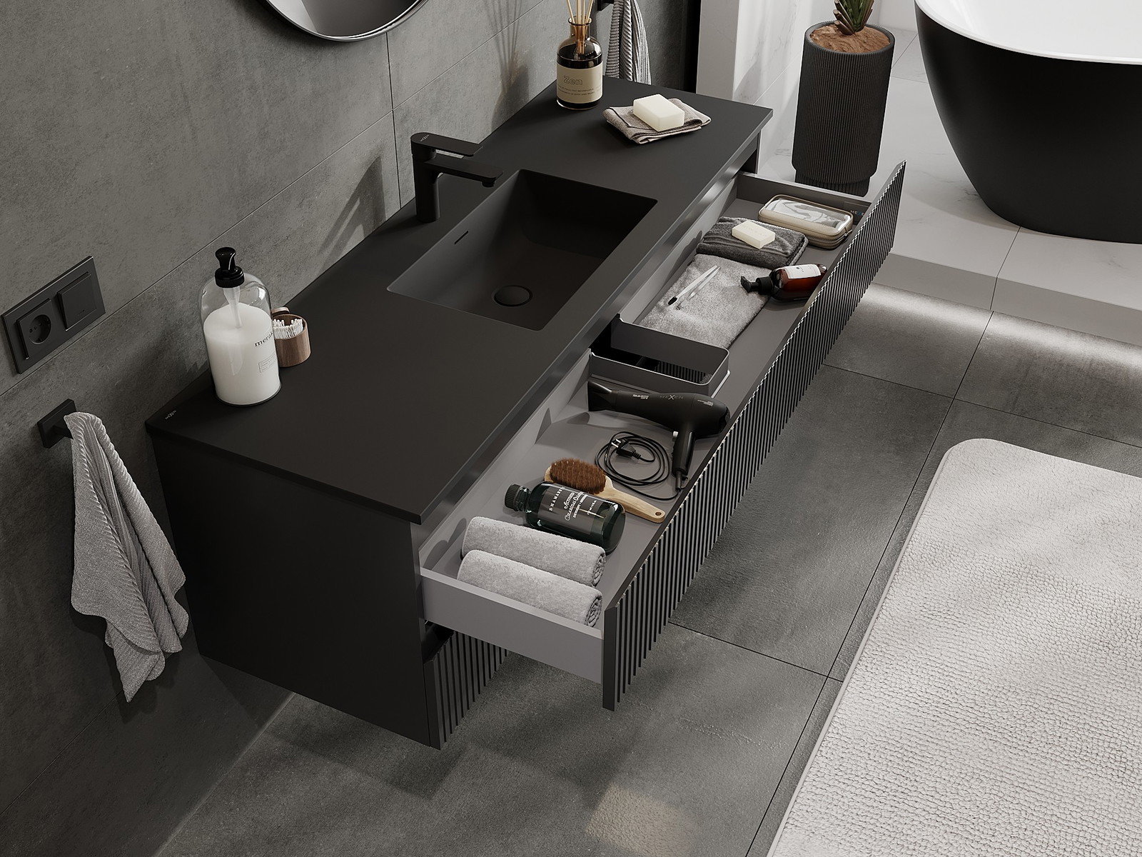 Mexen Rivel meuble de salle de bain 140 cm avec lavabo Otis, 2 tiroirs, rainuré, noir mat - 91A20-14047-2-BFF71-W18M71