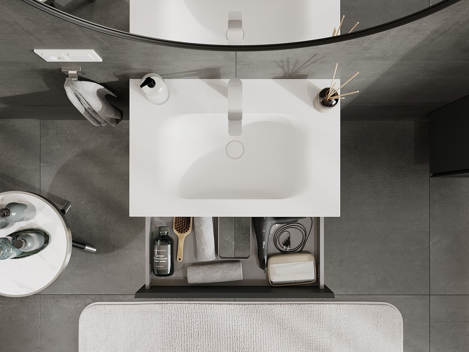 La découpe dans le tiroir est conçue de manière à accueillir le siphon, qui est nécessaire dans les installations de lavabo. Ainsi, le meuble peut être installé de manière pleinement fonctionnelle, sans devoir renoncer à l'espace du tiroir au profit de l'installation.