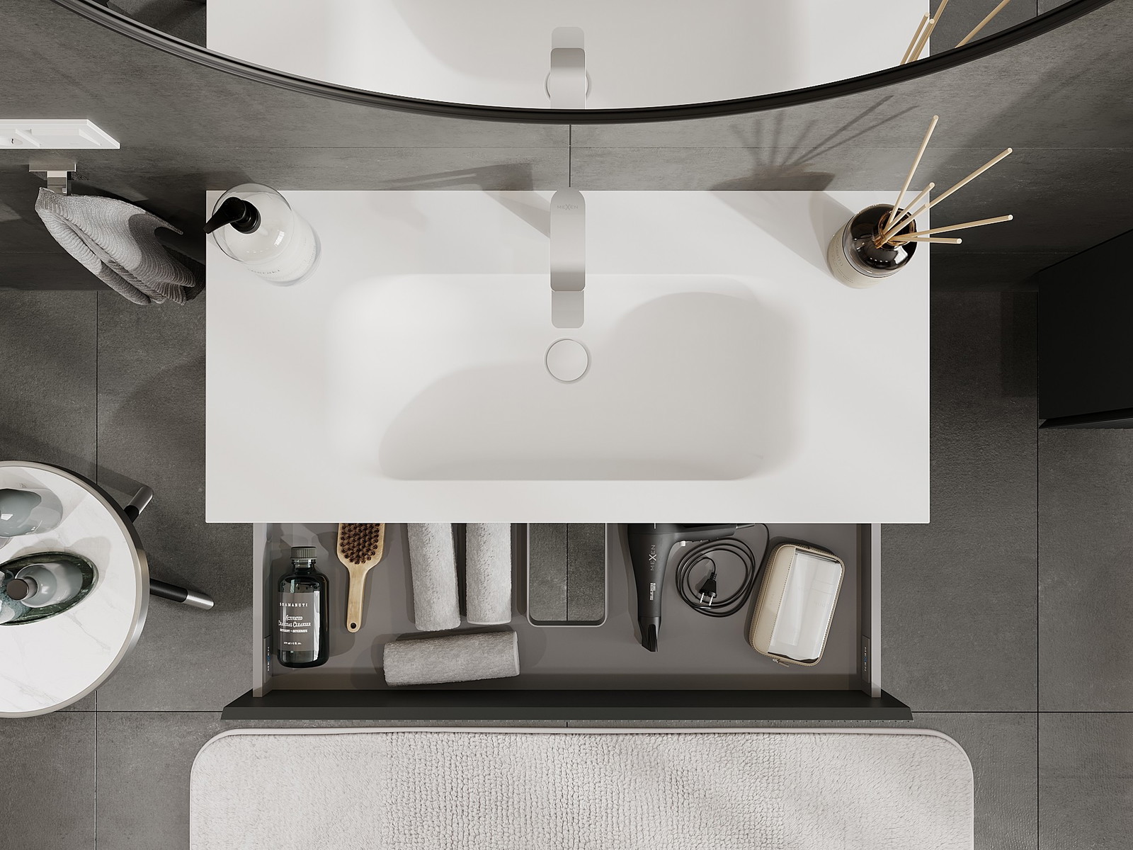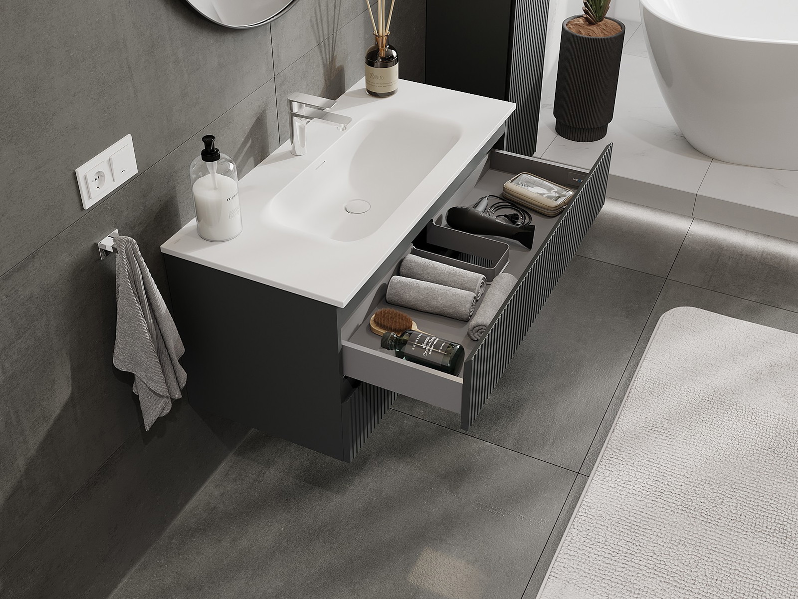 La découpe dans le tiroir est conçue de manière à accueillir le siphon, qui est nécessaire dans les installations de lavabo. Ainsi, le meuble peut être installé de manière pleinement fonctionnelle, sans devoir renoncer à l'espace du tiroir au profit de l'installation.