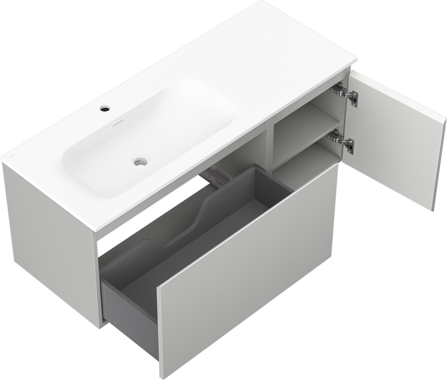 La découpe dans le tiroir est conçue de manière à accueillir le siphon, qui est nécessaire dans les installations de lavabo. Ainsi, le meuble peut être installé de manière pleinement fonctionnelle, sans devoir renoncer à l'espace du tiroir au profit de l'installation.