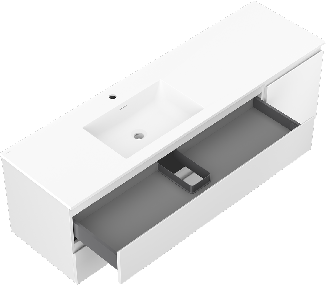 La découpe dans le tiroir est conçue de manière à accueillir le siphon, qui est nécessaire dans les installations de lavabo. Ainsi, le meuble peut être installé de manière pleinement fonctionnelle, sans devoir renoncer à l'espace du tiroir au profit de l'installation.