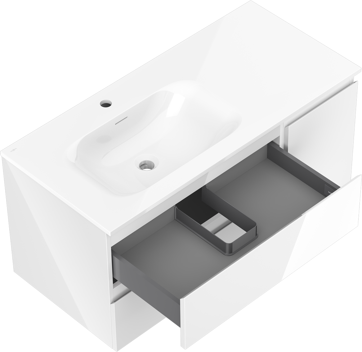 La découpe dans le tiroir est conçue de manière à accueillir le siphon, qui est nécessaire dans les installations de lavabo. Ainsi, le meuble peut être installé de manière pleinement fonctionnelle, sans devoir renoncer à l'espace du tiroir au profit de l'installation.