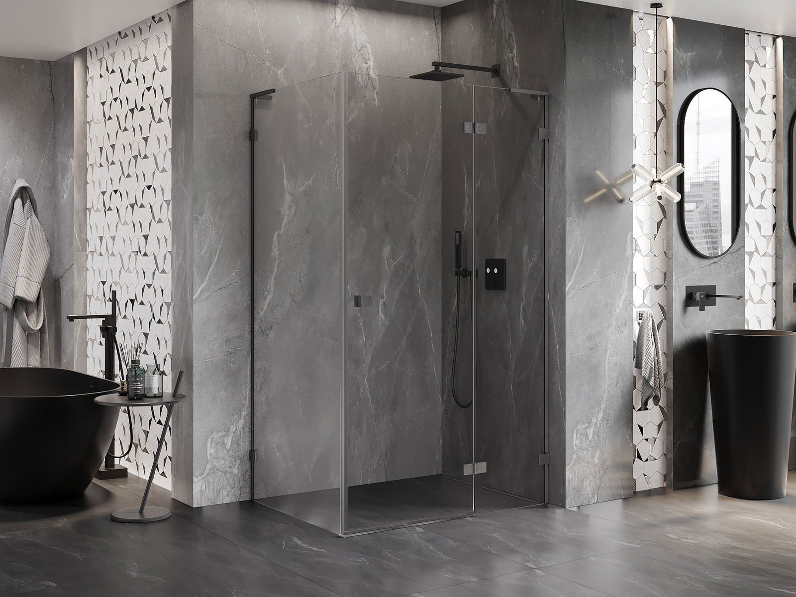 La poignée pratique et confortable est fabriquée en métal durable et résistant. Sa forme à la mode, combinée à une finition assortie à la couleur des profilés, donne à l'ensemble un aspect moderne et stylé, soulignant l'esthétique de chaque salle de bain.