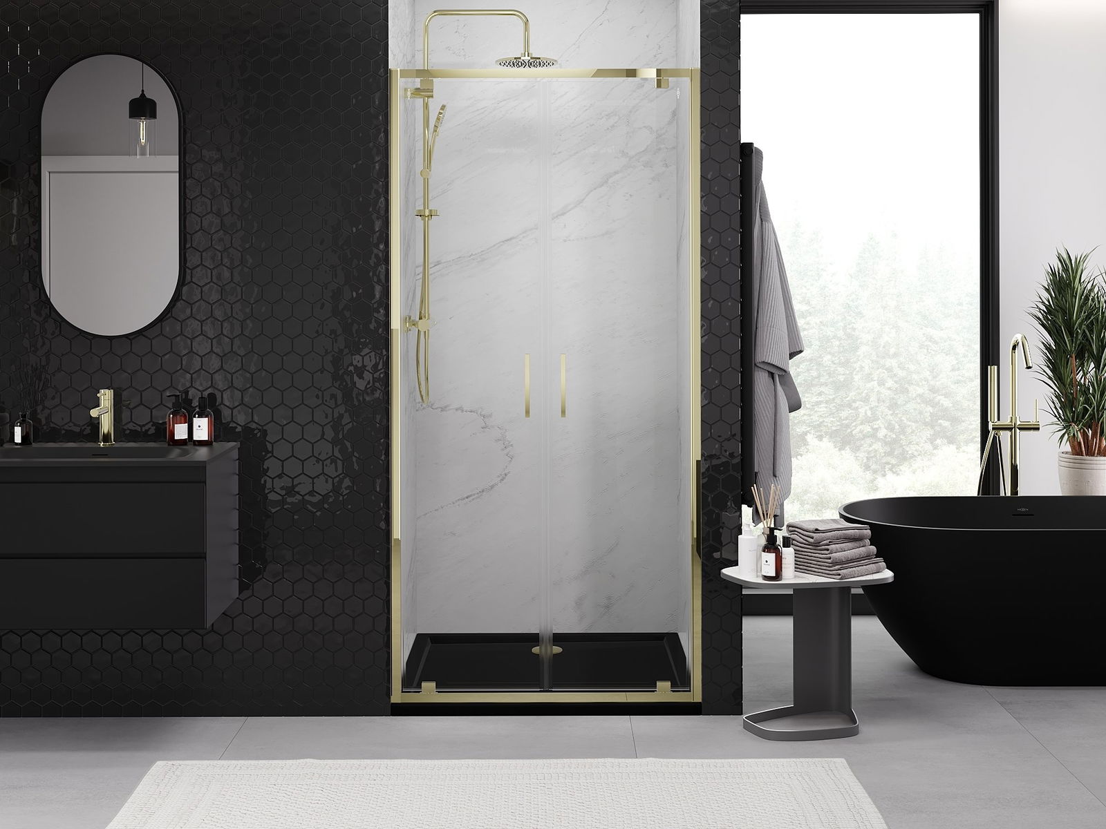 La poignée pratique et confortable est fabriquée en métal durable et résistant. Sa forme à la mode, combinée à une finition assortie à la couleur des profilés, donne à l'ensemble un aspect moderne et stylé, soulignant l'esthétique de chaque salle de bain.