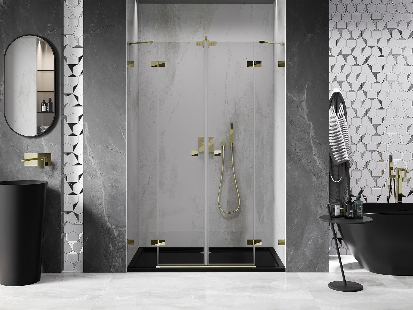 La poignée pratique et confortable est fabriquée en métal durable et résistant. Sa forme à la mode, combinée à une finition assortie à la couleur des profilés, donne à l'ensemble un aspect moderne et stylé, soulignant l'esthétique de chaque salle de bain.