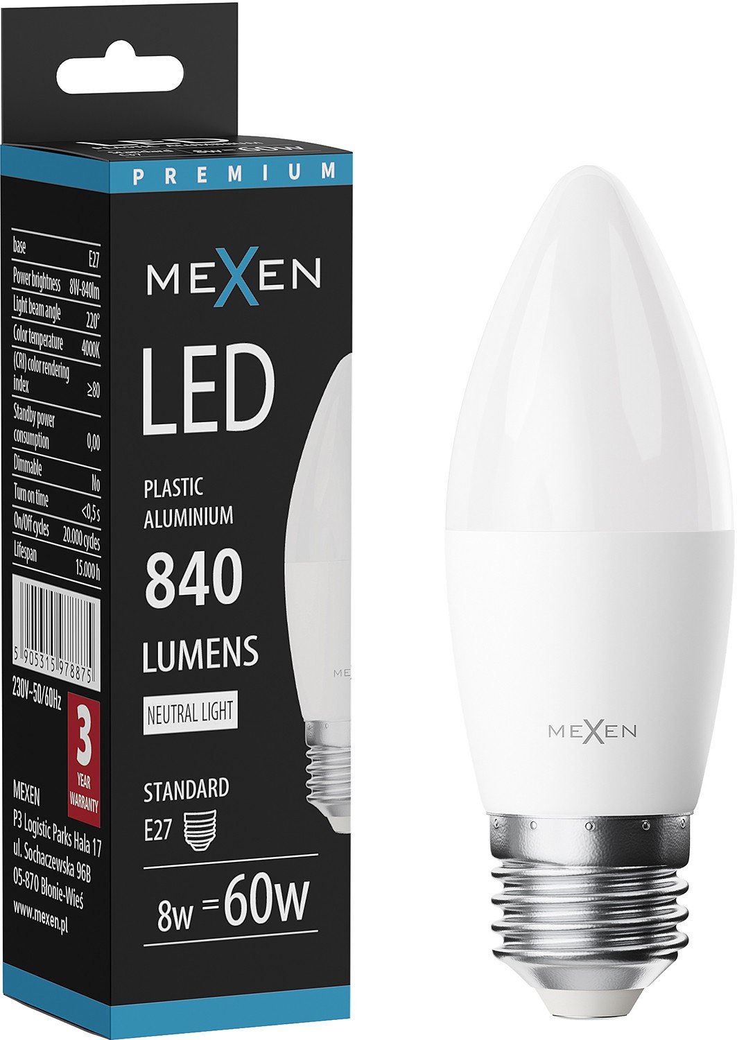 Mexen Nova Ampoule LED E27, C37, 8W, Neutre - 4000K, 840 lm - L102-E27-0840-01
