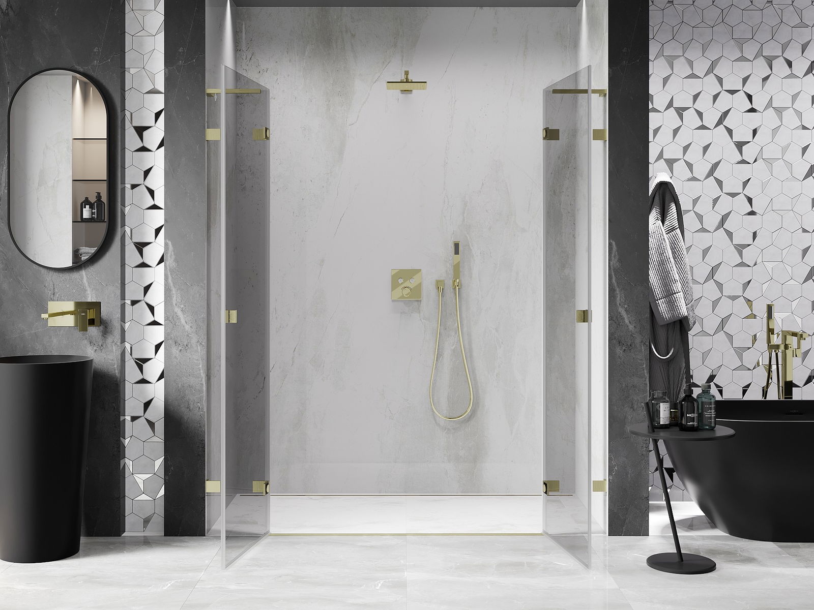 La poignée pratique et confortable est fabriquée en métal durable et résistant. Sa forme à la mode, combinée à une finition assortie à la couleur des profilés, donne à l'ensemble un aspect moderne et stylé, soulignant l'esthétique de chaque salle de bain.